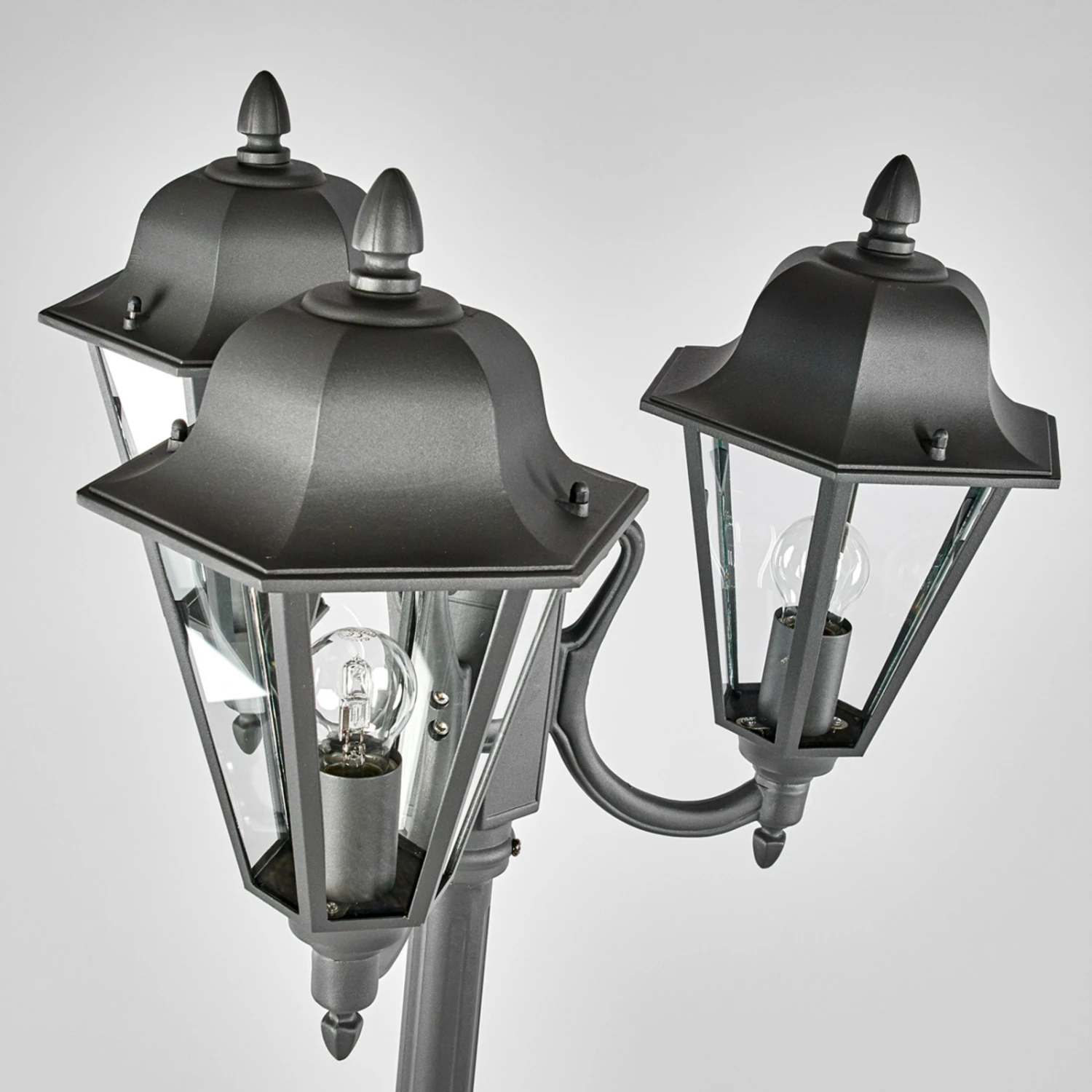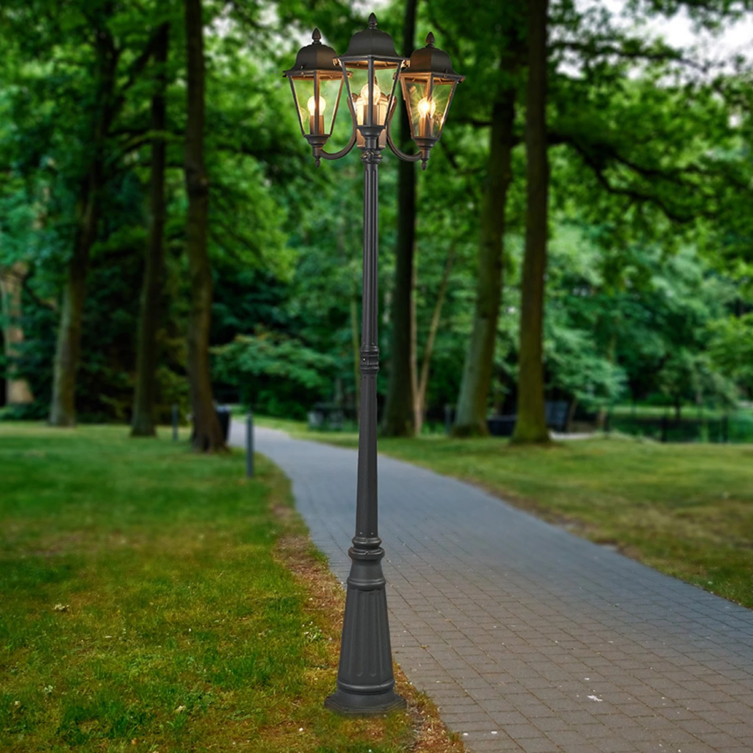 Dieser Kandelaber ist ein bezaubernder Lichtspender für den Außenbereich, der mit einem antik anmutenden Erscheinungsbild glänzen kann. So sind die Schirme mit dachförmiger Abdeckung sehr detailreich gestaltet worden und sie erinnern deutlich an die Laternen, die Straßen und Parks bereits beleuchtet haben, als an elektrische Beleuchtung noch nicht zu denken war. Das Gestell aus Metall hat eine dezente, grafitgraue Oberfläche und die klaren Schirmeinsätze bestehen aus Glas.