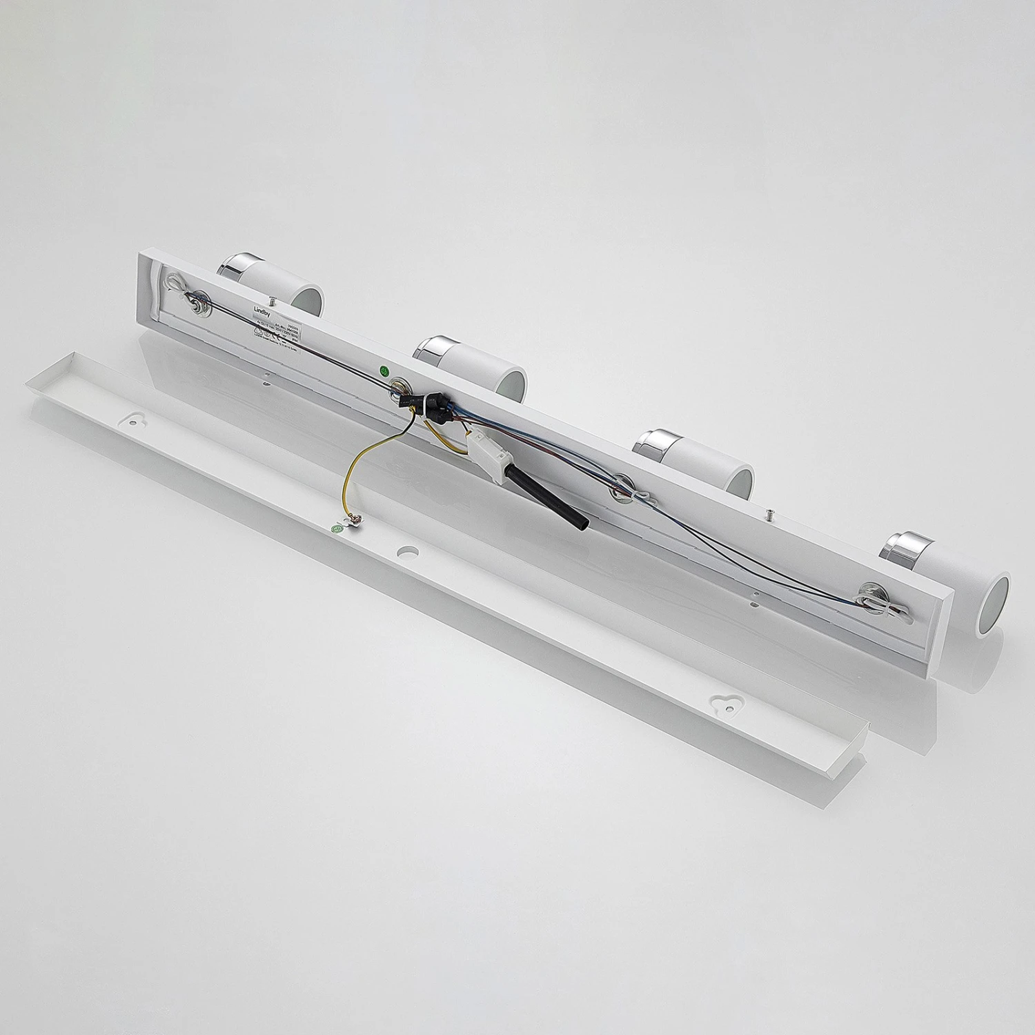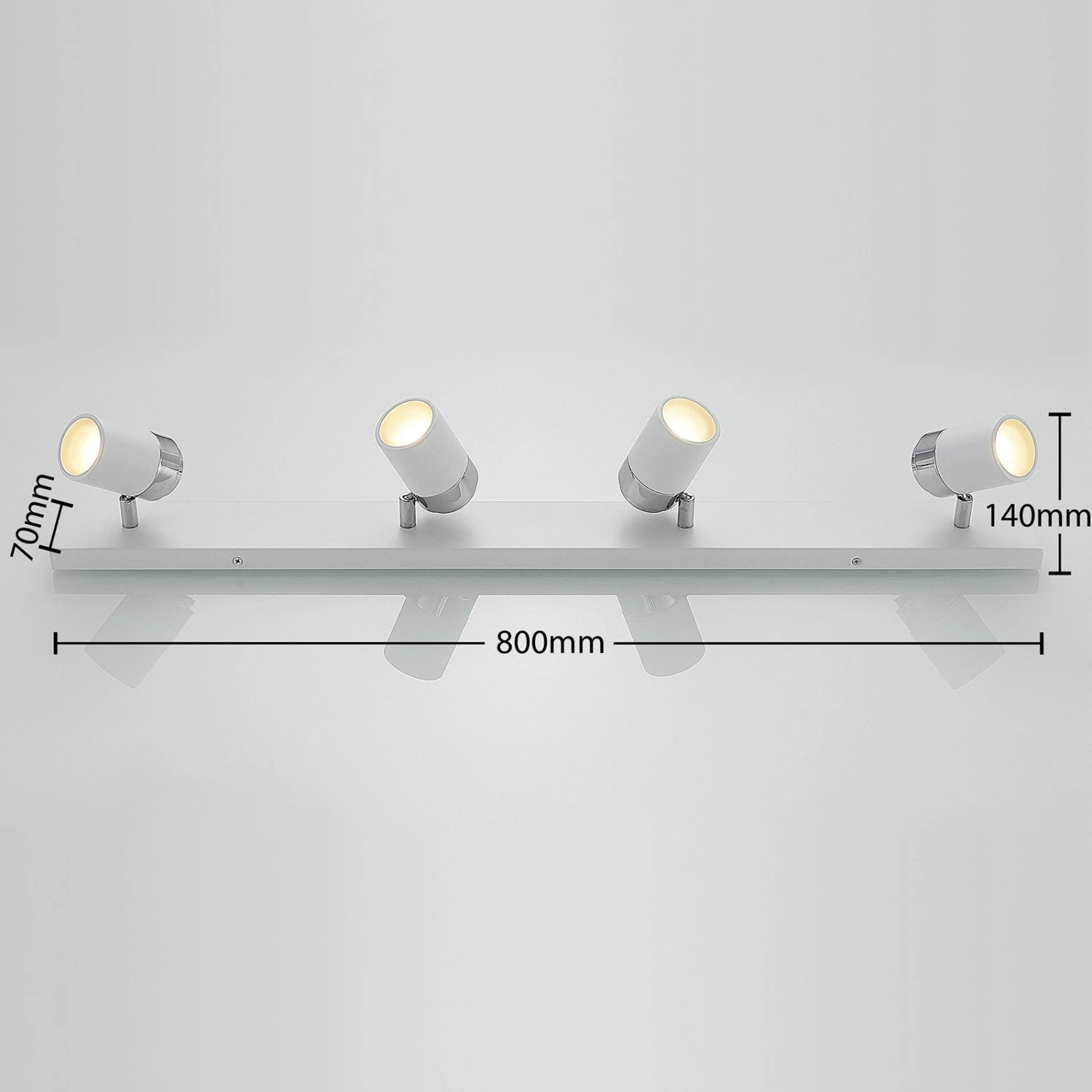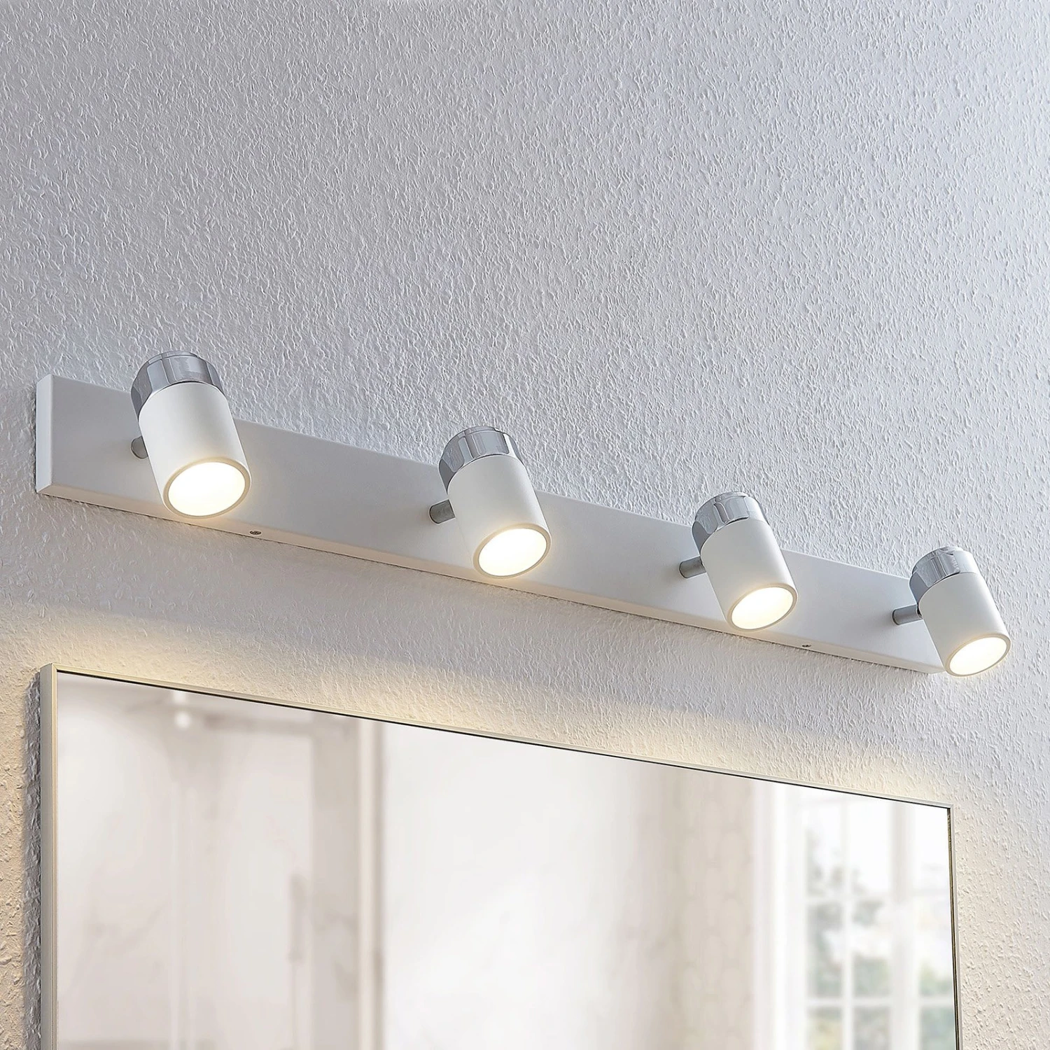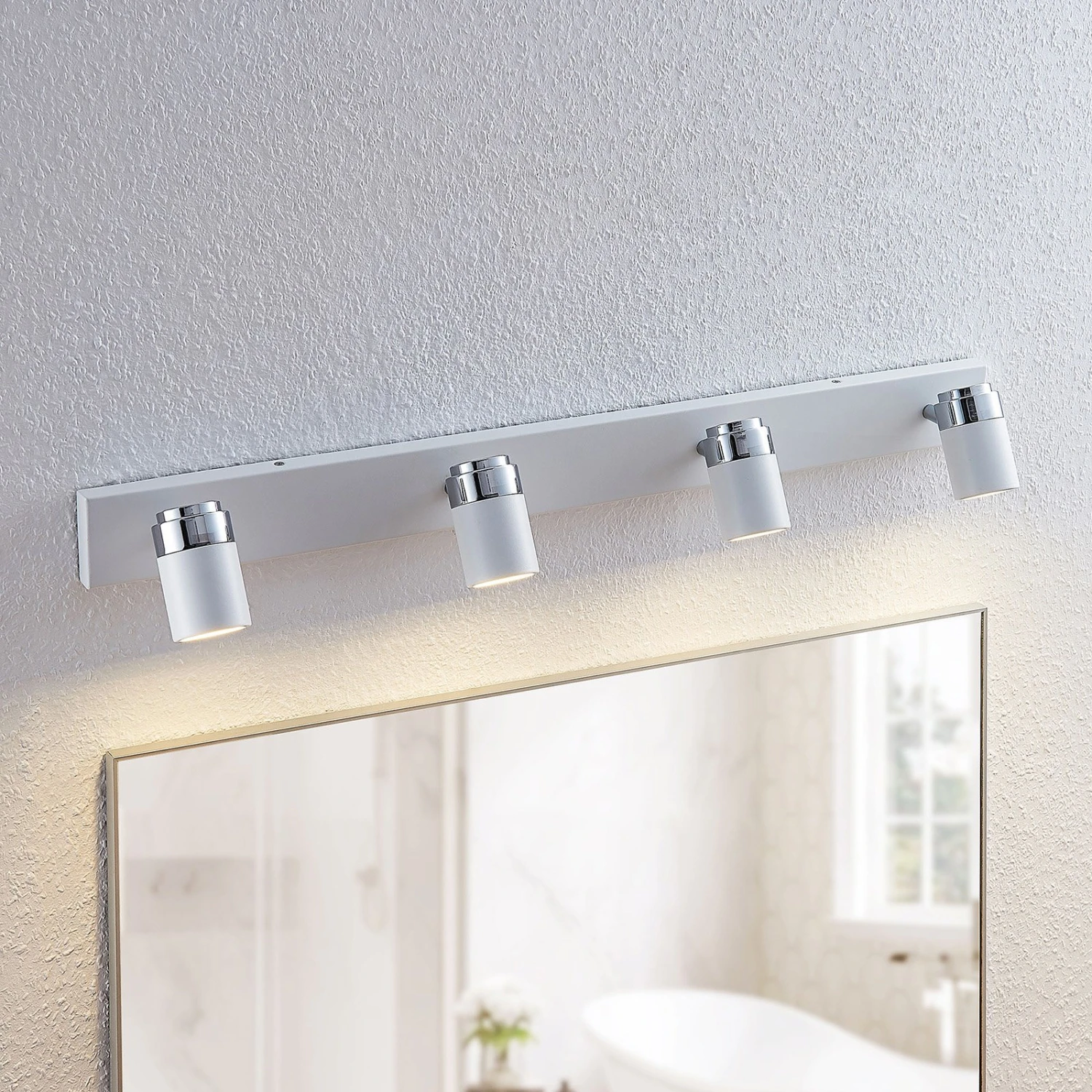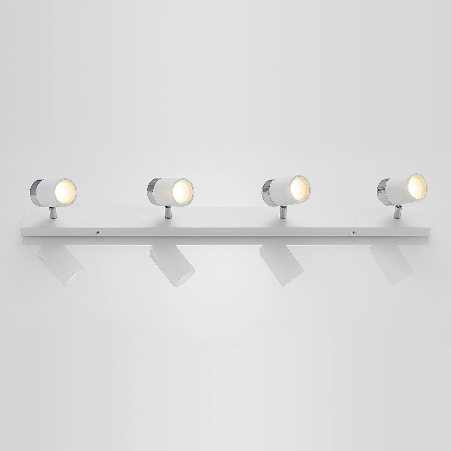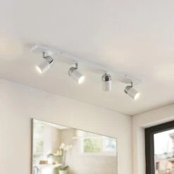 Kardo erzielt in der vierflammigen Ausführung, abhängig von der Wahl des Leuchtmittels, eine gute Helligkeit und eignet sich deshalb gut für die Grundausleuchtung eines Badezimmers. Die Schutzart IP44 zeigt an, dass ein ausreichender Schutz vor Schmutz und Nässe besteht. Alle Schirme lassen sich getrennt voneinander bewegen, so dass die Lichtausrichtung individuell gehalten werden kann. Die weiße Oberfläche und die Details in Chrom ergänzen einander perfekt und gerade in modernen Räumlichkeiten kommt der Deckenstrahler richtig gut an.