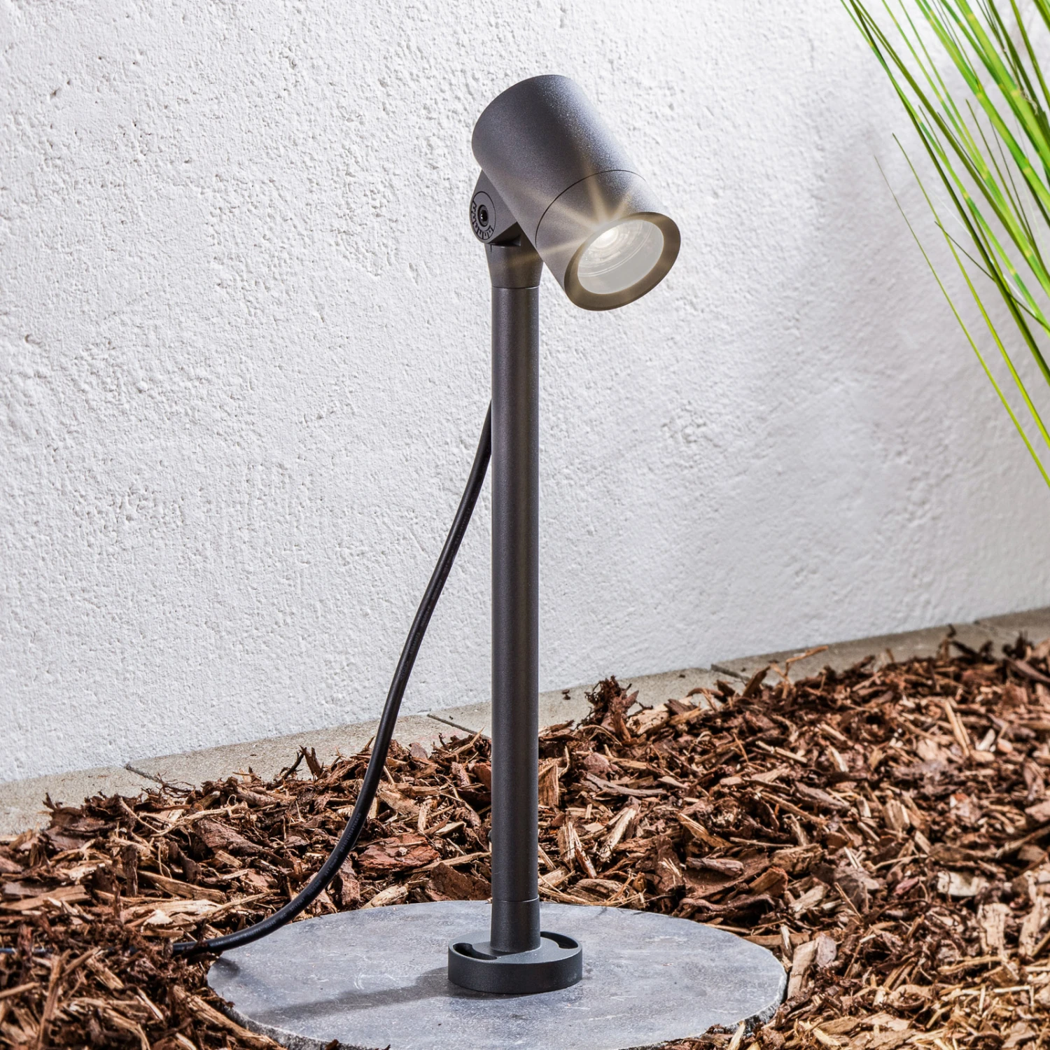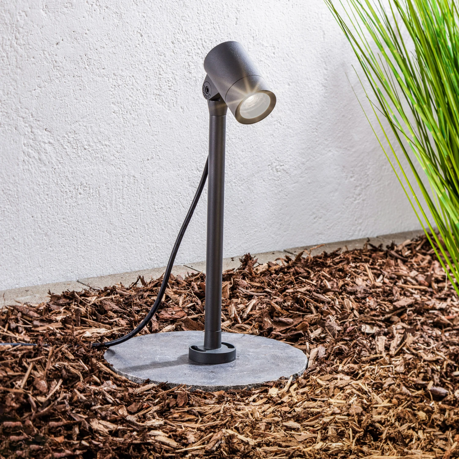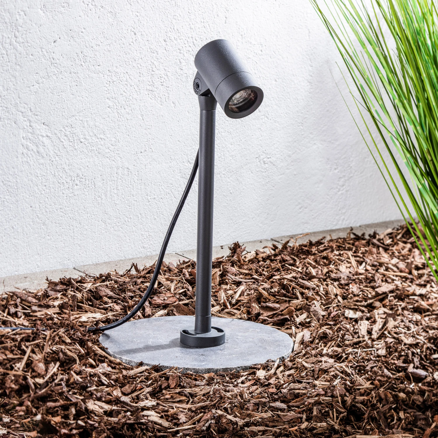 Der Außenstrahler Hemmani punktet mit seinem schlanken Look in Dunkelgrau, der sich hervorragend in moderne Umgebungen einfügen lässt, ohne sofort aufzufallen. Das Gestell sowie der zylinderförmige Spot wurden aus Aluminiumdruckguss hergestellt und besitzen die Schutzart IP65, dank der der Strahler langlebig im Außenbereich dienen kann. Das Besondere an Hemmani ist, dass er sich in seiner Höhe verstellen lässt (44,8 cm – 59,8 cm) und der Spot flexibel neigbar ist. Das macht es möglich, unterschiedliche Objekte und Bereiche im Garten stilvoll anstrahlen zu lassen, wie zum Beispiel den Gartenweg, eine Mauer oder auch Sträucher.