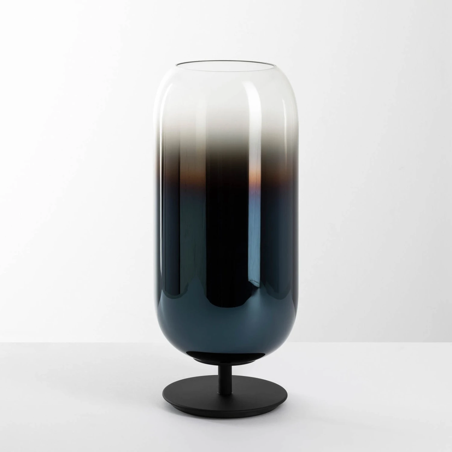 Gople Mini ist eine Tischleuchte, die mit ihrem Schirm aus geblasenem Glas, der einen dekorativen Farbverlauf aufweist, an jedem Platz ästhetisch wirkt. Das Licht der eingesetzten Retrofitlampe (nicht enthalten) wird durch die Transparenz des Glases rundherum in die Umgebung transportiert, wobei die ungewöhnliche Färbung des Glases eine reizvolle Lichtstimmung erzeugt. Das von Hand nach venezianischer Tradition bearbeitete Glas macht aus jeder Leuchte ein Unikat.