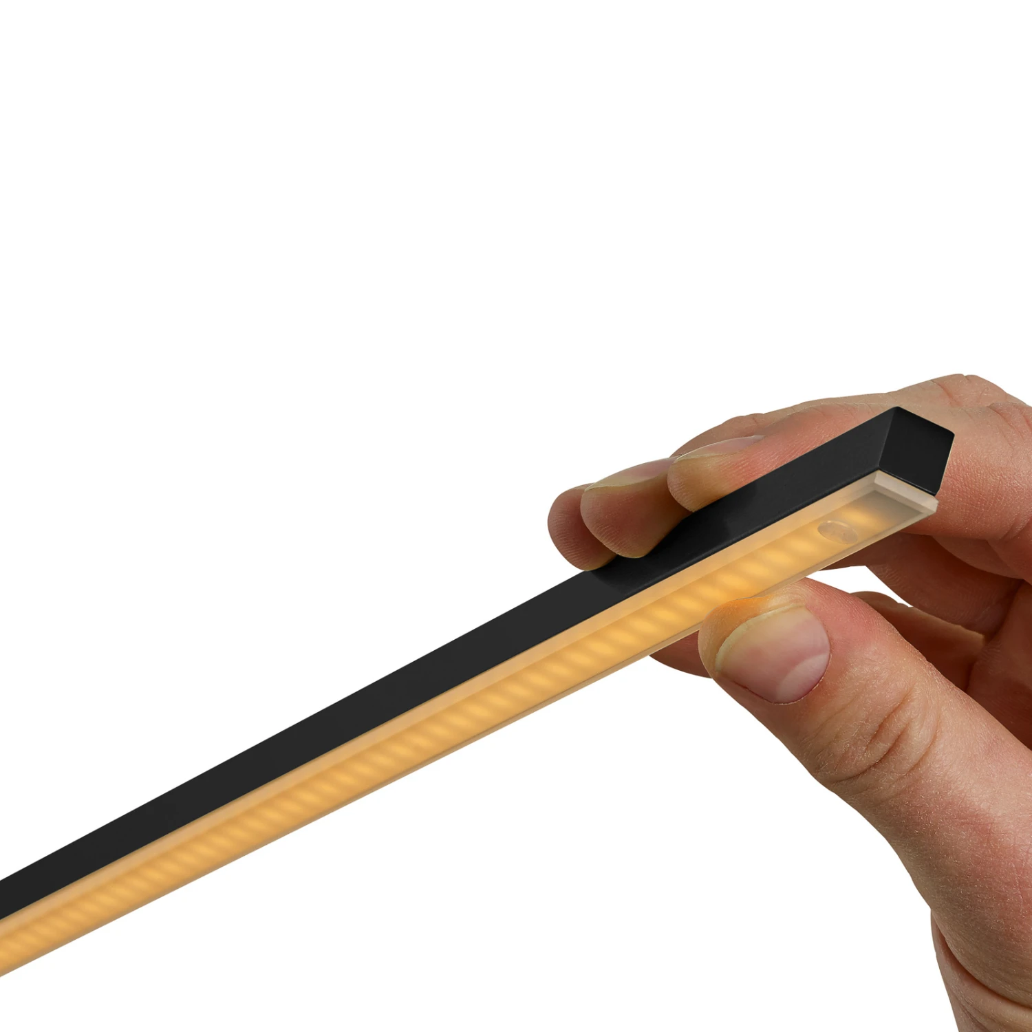 Slim – der Name der LED-Pendelleuchte sagt bereits alles über ihr Design aus. Die Leuchte ist mit einem sehr schmalen Lichtelement ausgestattet und wirkt sehr filigran und modern. In der Leuchte wurden warmweiße LEDs mit einer sehr guten Farbwiedergabe verbaut (Ra > 90), die sich über die Vertical-dim-Funktion in der Helligkeit regulieren lassen. Das Dimmen funktioniert ganz einfach über den Leuchtenschirm selbst. Kippt man ihn um 12° zur Seite, wird der Dimmvorgang gestartet. Ist die gewünschte Helligkeit erreicht, fixiert man sie, indem der Schirm wieder in die Ausgangsposition gebracht wird. Die nun festgelegte Beleuchtung wird durch die Memory-Funktion gespeichert und erscheint beim nächsten Einschalten direkt. Nicht nur die Helligkeit verringert sich mit dem Dimmen, auch die Lichtfarbe wird mit abnehmender Helligkeit wärmer (dim to warm 3.000 K – 2.200 K).