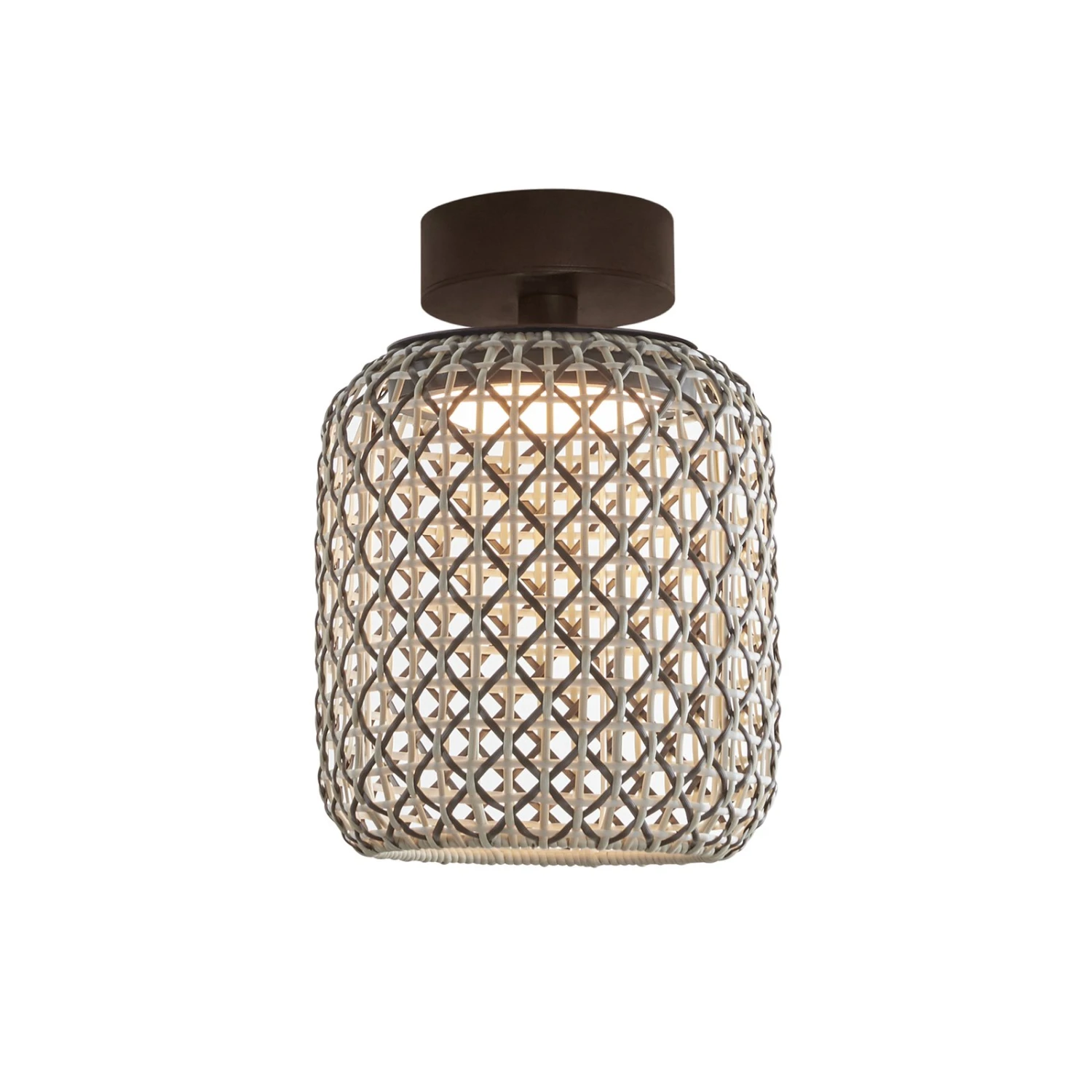 Die Deckenleuchte Nans hat einen Schirm aus einem Flechtgewebe, das aus synthetischen Fasern besteht. Die Schutzart IP54 schützt die Leuchte vor Feuchtigkeit und Staub, so dass sie problemlos im Außenbereich, also in Pavillons, auf der Terrasse oder dem Balkon einsetzbar ist.
