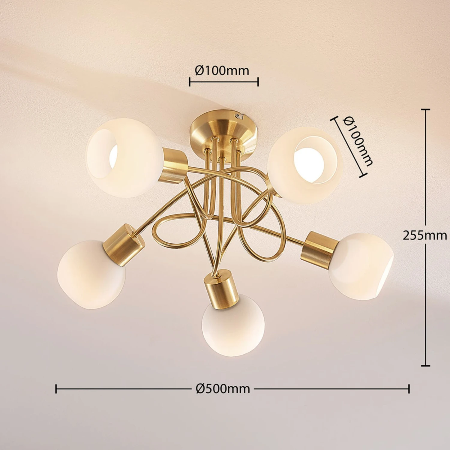Klassisch aussehende Deckenleuchte Elaina Elaina hat ein verschlungen wirkendes Gestell mit einem attraktiven, klassisch ausschauenden Messingfinish. Ergänzt wird das Gestell der Deckenleuchte von fünf Schirmen aus opalweißem Glas, die eine Kugelform besitzen und vorne offen sind. Darin können energiesparenden LED-Lampen eingesetzt werden und der Lichtschein erscheint gleichmäßig und wohnlich, so dass die Deckenlampe für Wohn- und Schlafzimmer gleichermaßen geeignet ist.