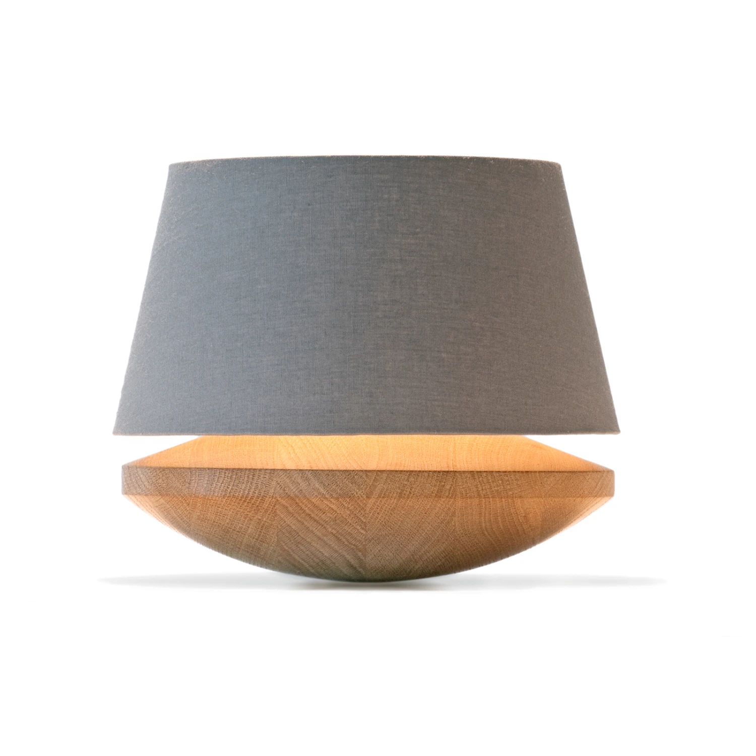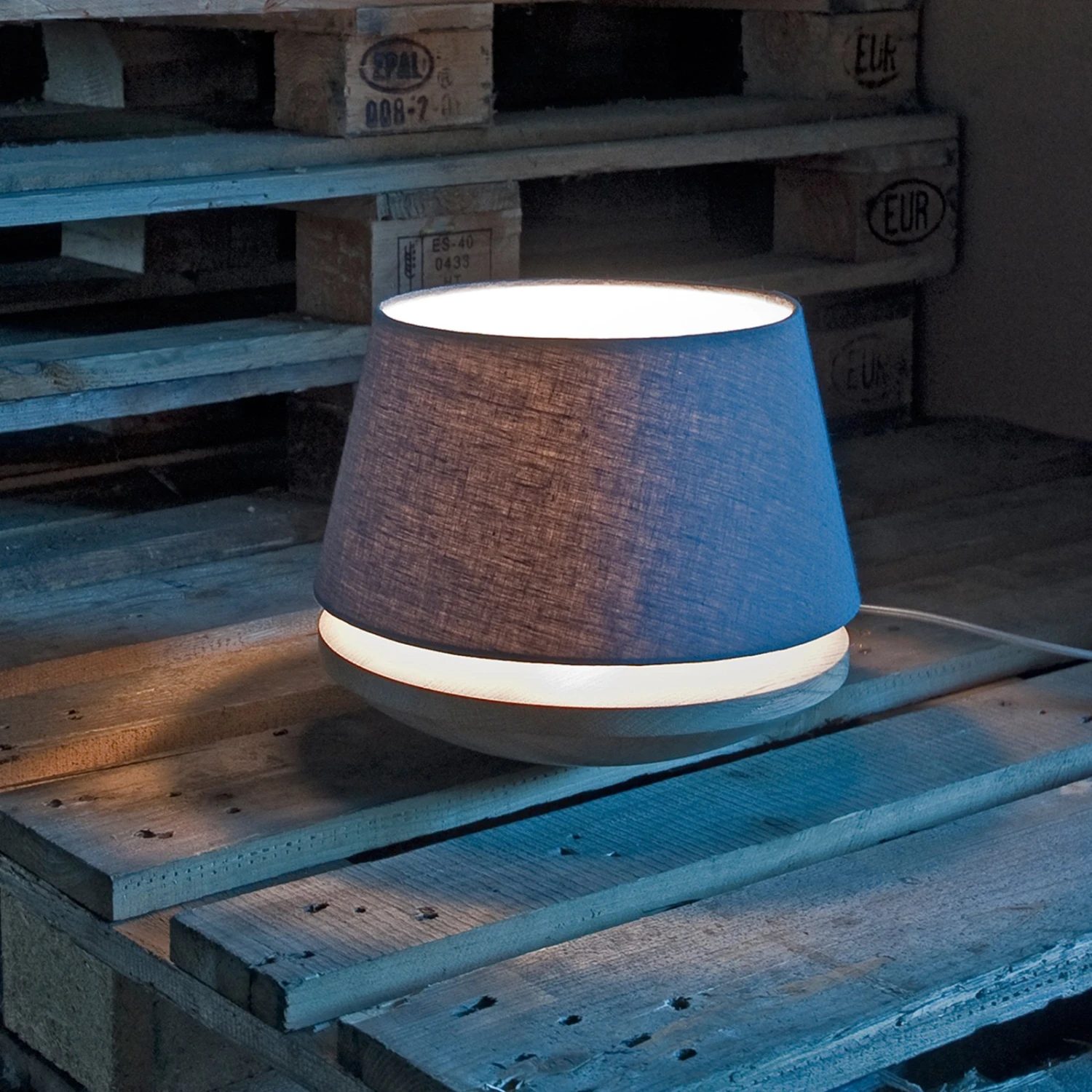 Moderne Tischleuchte Kjell verbindet Holz und Leinen