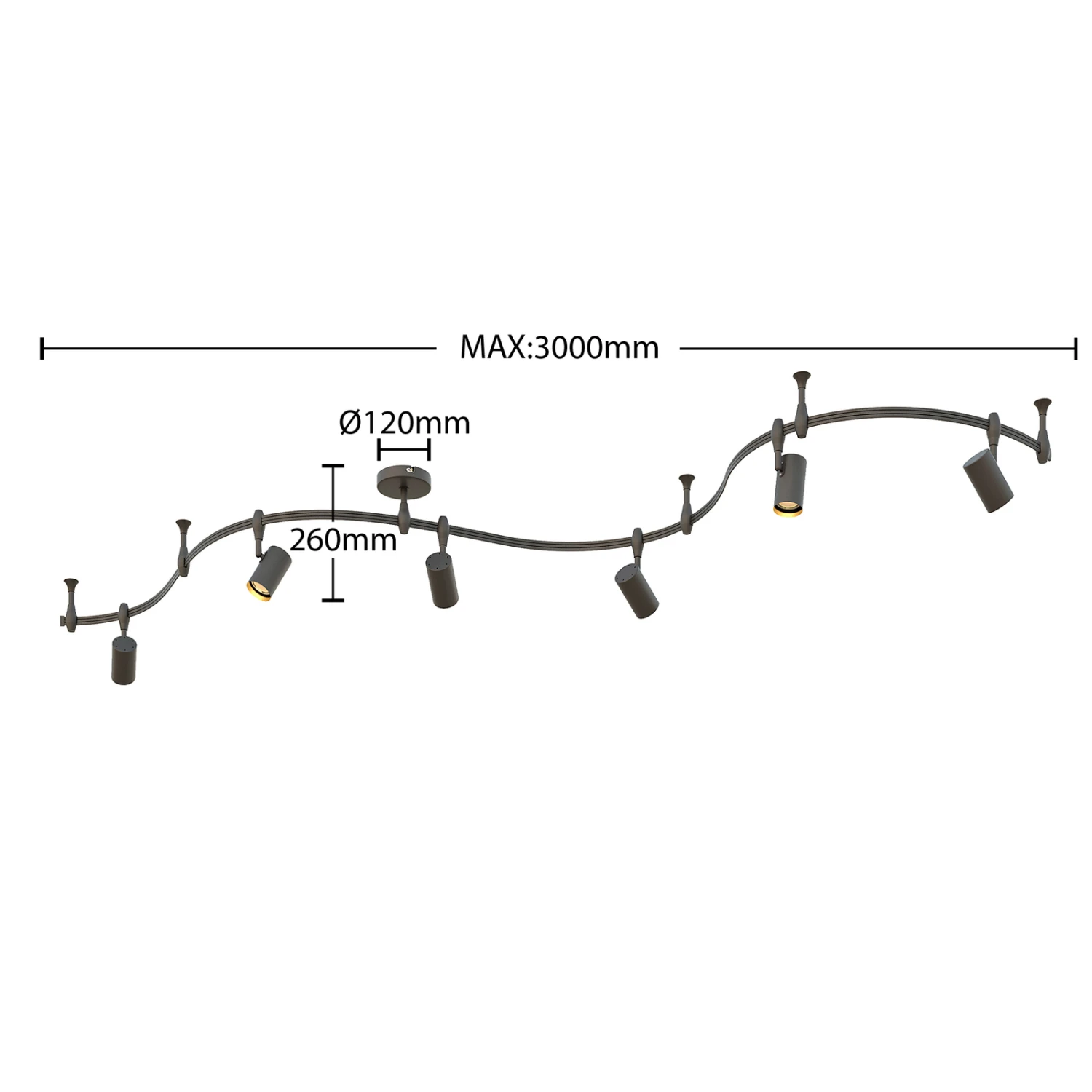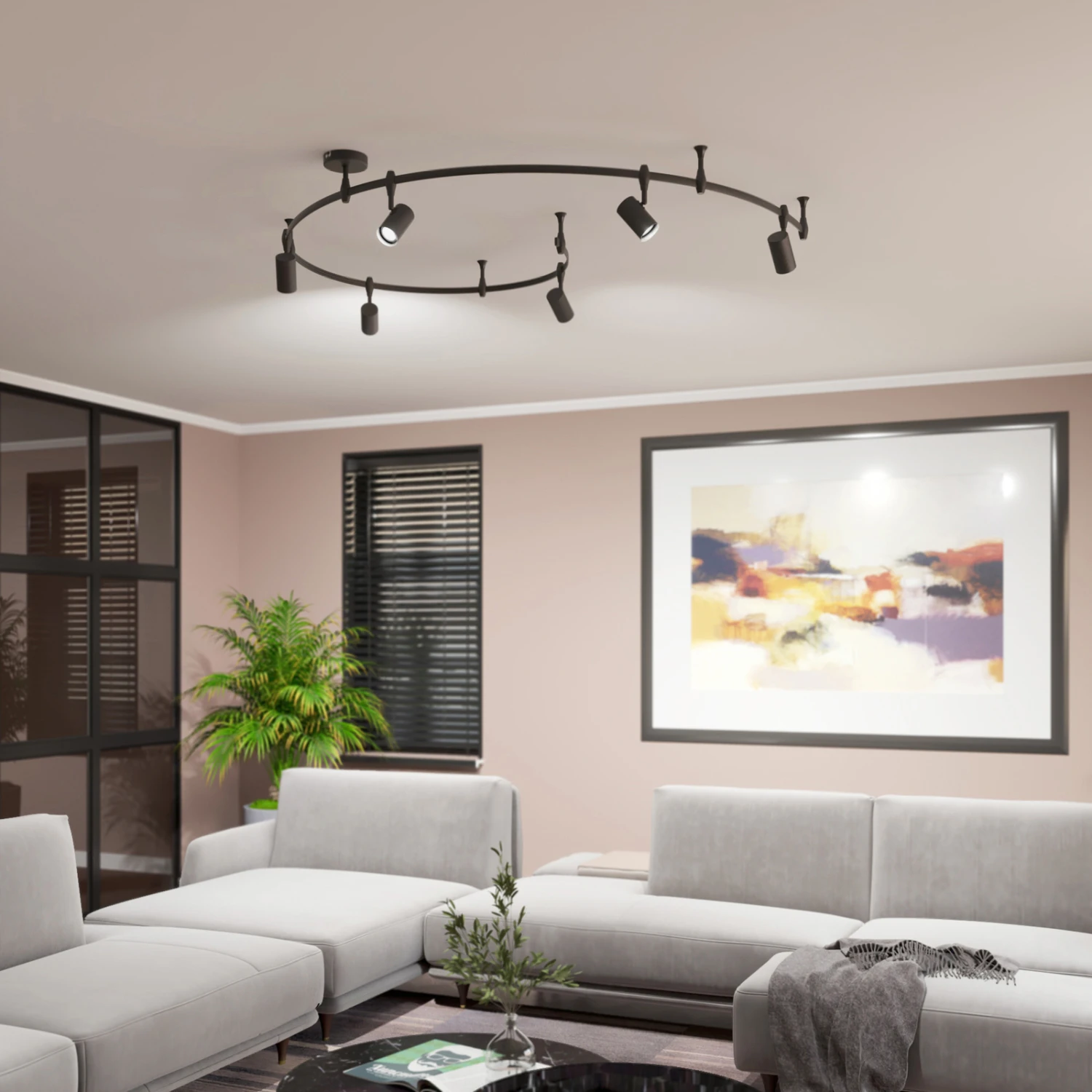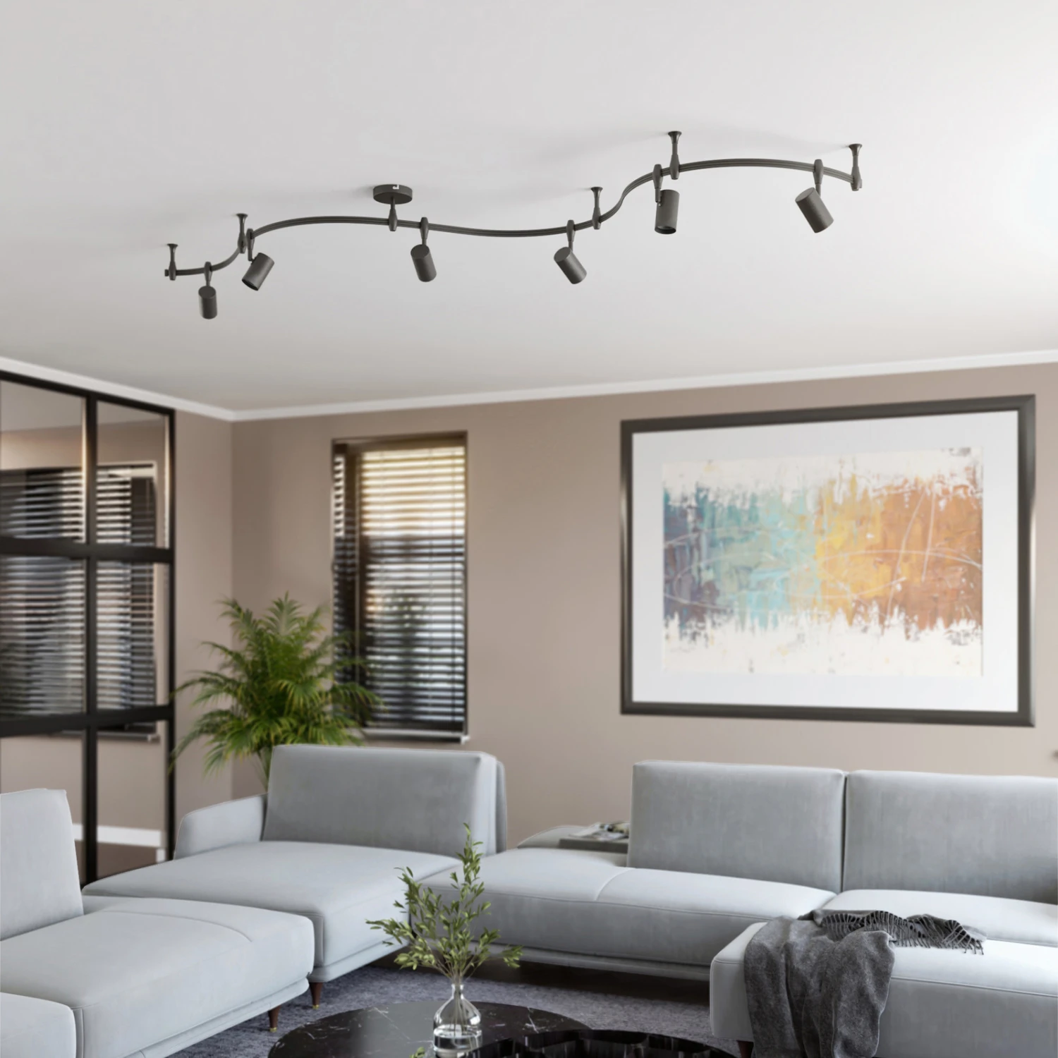 Das 1-Phasen-Schienensystem Delila ist stilvoll und leicht verspielt. Es ist aus Aluminium und Stahl gefertigt und besteht aus einer schwungvoll verlaufenden Strebe, an der sechs zylinderförmige Leuchtenschirme angebracht wurden. Sie kann mit GU10-Leuchtmitteln bestückt werden, und durch die Beweglichkeit der Schirme wird die Ausleuchtung jeder Ecke garantiert. Die dezente Farbgebung in Sandschwarz und das glatte Material geben ihm ein elegantes Aussehen und ermöglichen ein müheloses intergrieren in moderne Einrichtungsstile. Das 1-Phasen-Schienensystem Delila setzt dezente Akzente an Wohnungsdecken und rundet das Mobiliar wohlwollend ab.