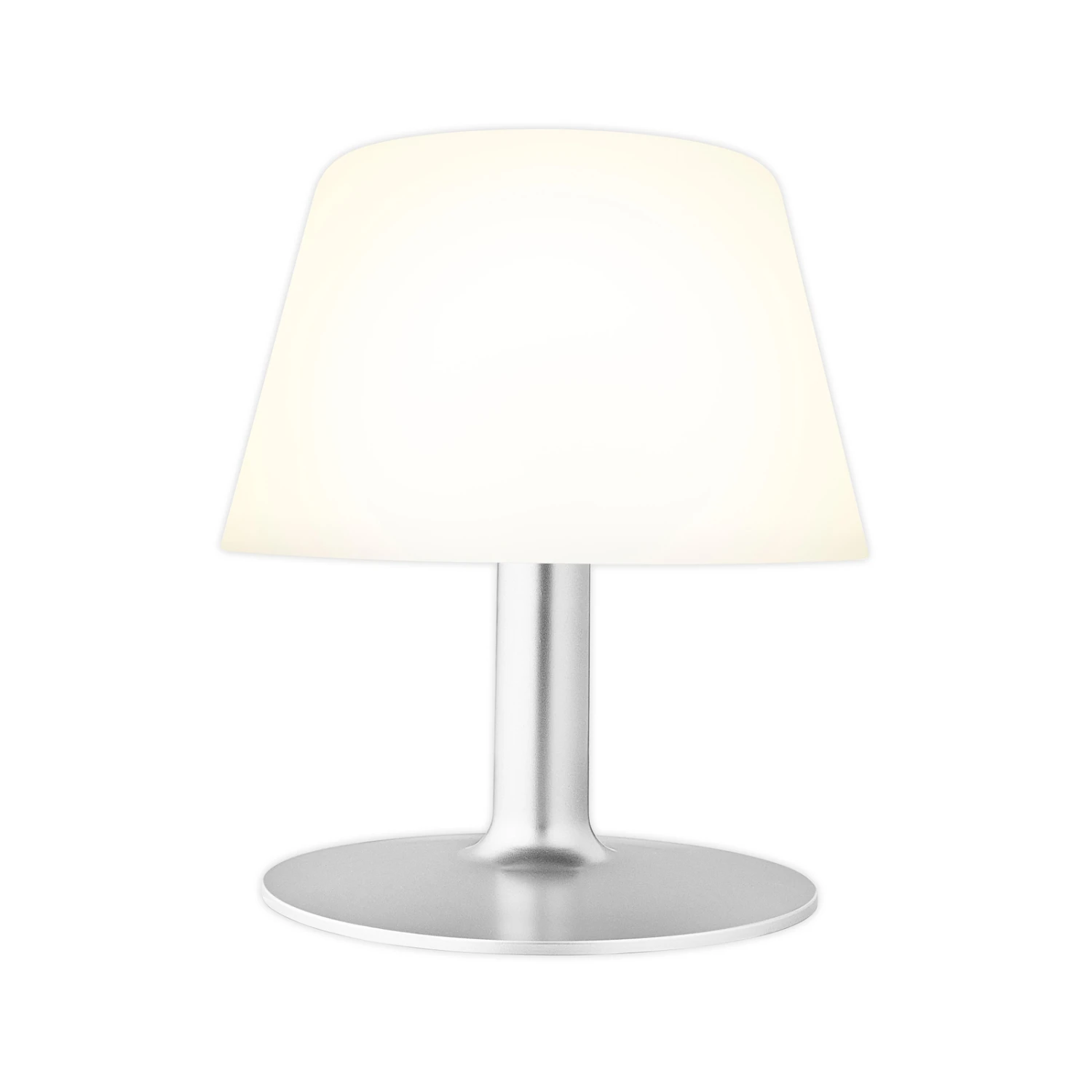 Aus einem Fuß aus silbern lackiertem Stahl und einem Schirm aus opalweißem Kunststoff setzt sich die LED-Solar-Tischleuchte SunLight zusammen. Sie ist sowohl staubdicht als auch gegen Strahlwasser geschützt und wird so zur dekorativen Lichtquelle auf der Terrasse oder dem Balkon. Da ein Solarpanel und Akkus integriert sind, lässt sie sich ohne zusätzliche Stromquelle nutzen.