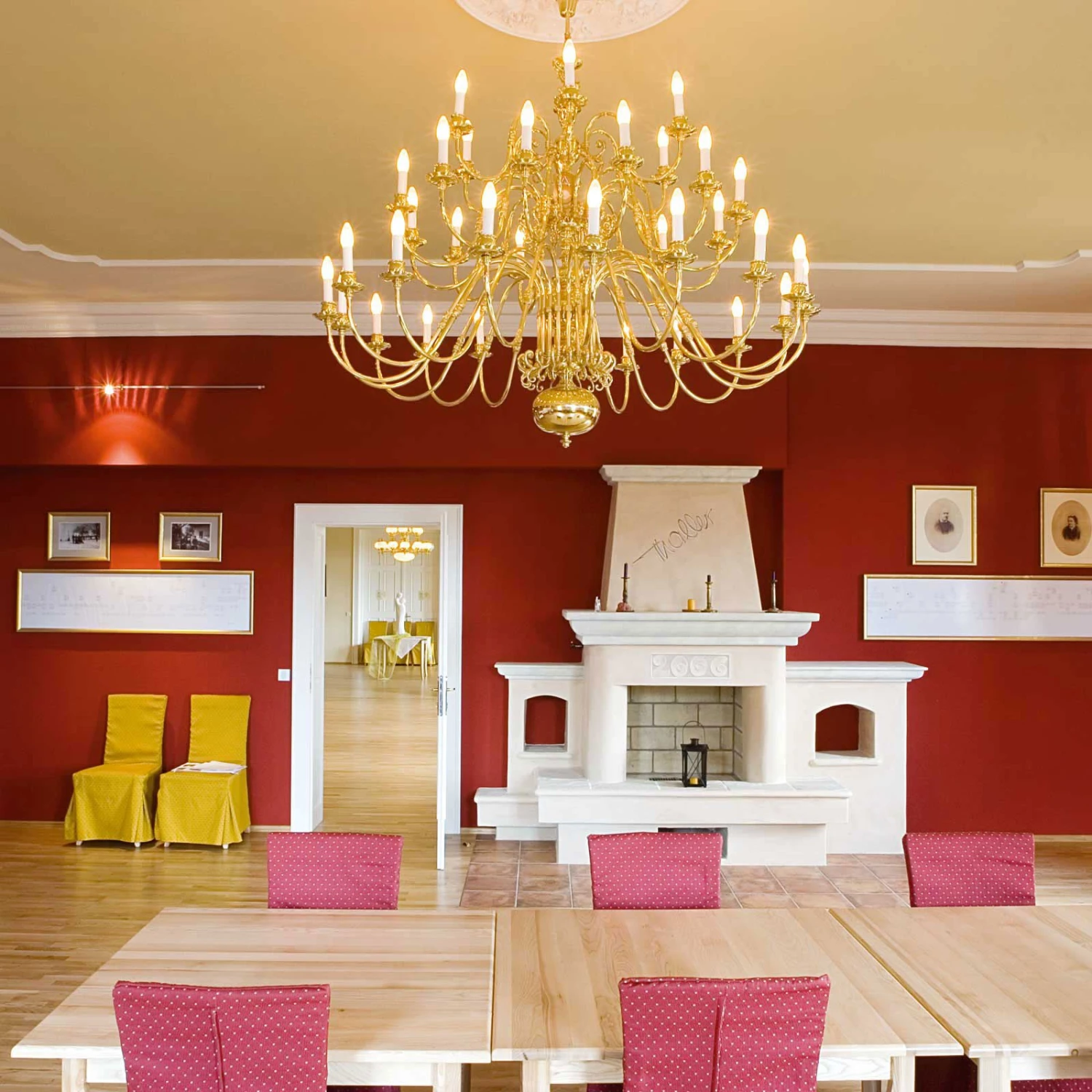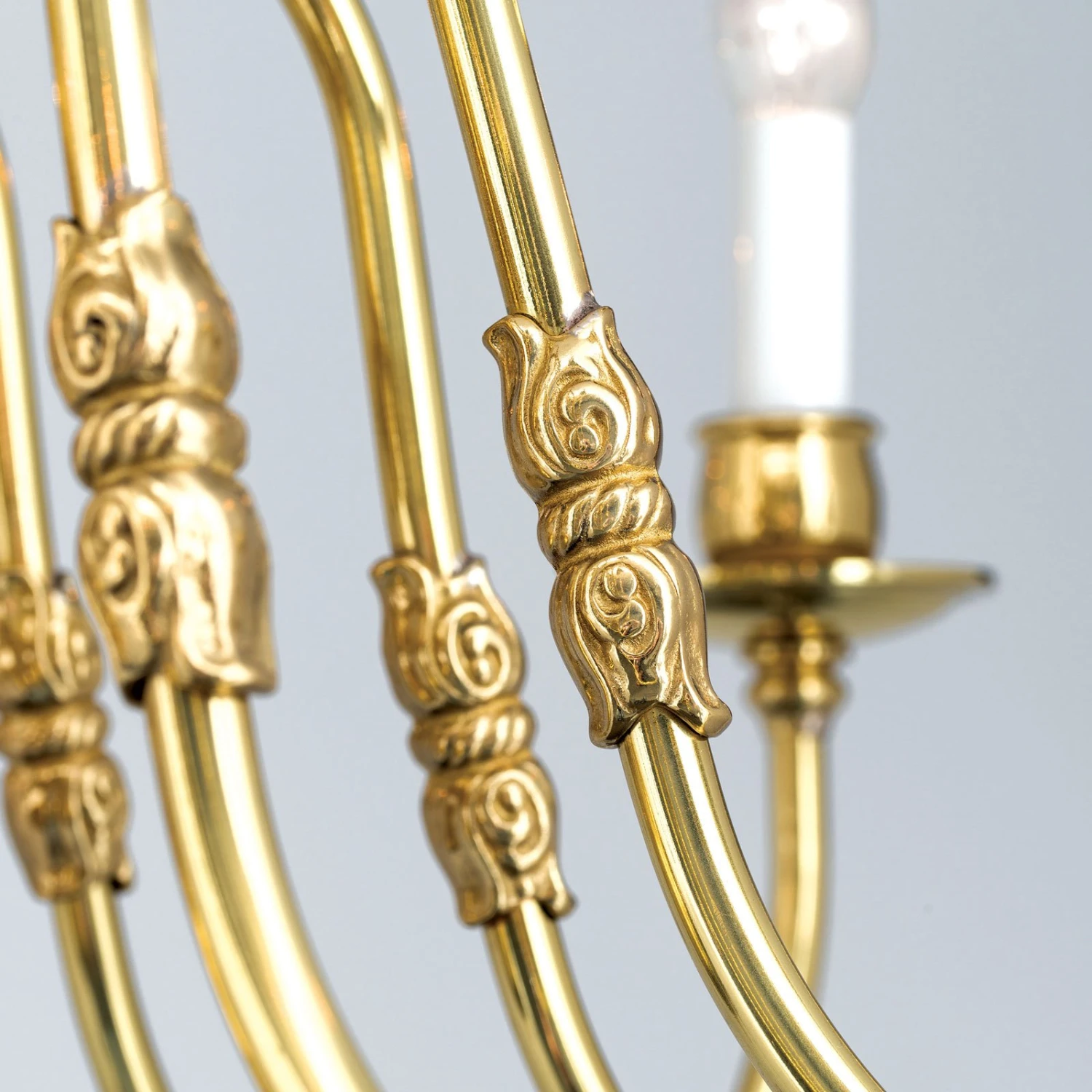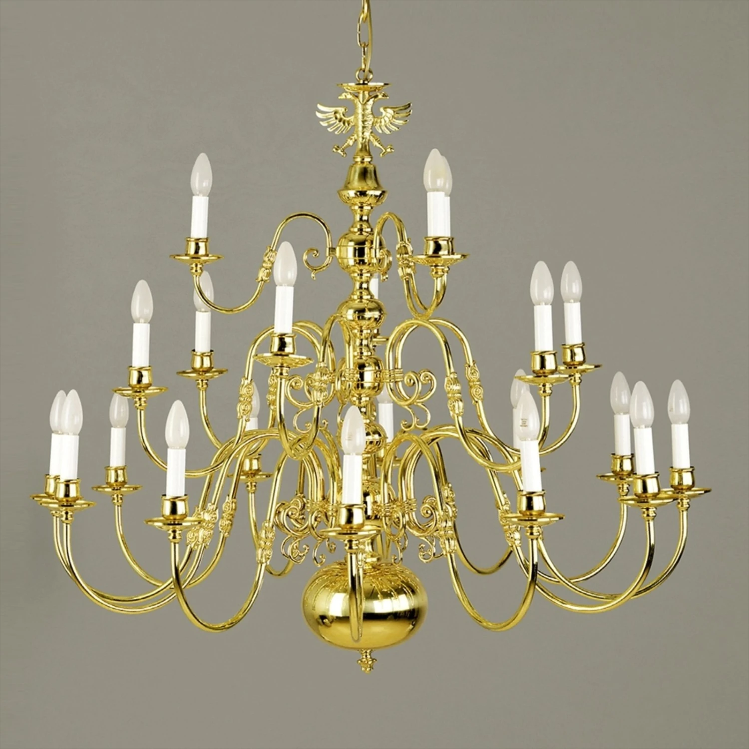 Der prächtige Kronleuchter Maximilian ist stilecht flämisch im Design und besticht durch ein Leuchtergestell in elegant poliertem Messing. Das imposante Leuchtenobjekt ist handgearbeitet. Die herrliche glänzende Oberfläche erzeugt eine prachtvolle optische Kombination mit den 21 weiß gehaltenen Kerzenfassungen. Die Leuchtenarme sind filigran und formschön gestaltet. Ein symmetrisch gespiegeltes Adler-Emblem schmückt den Kopf des Kronleuchters. Maximilian kann mit 21 Lampen eine große Räumlichkeit bequem erhellen. Die prunkvolle Erscheinung gefällt in jedem hochwertigen Festsaal. Kronleuchter Maximilian ist für repräsentative Anlässe wie geschaffen. Österreichisches Qualitätsprodukt.