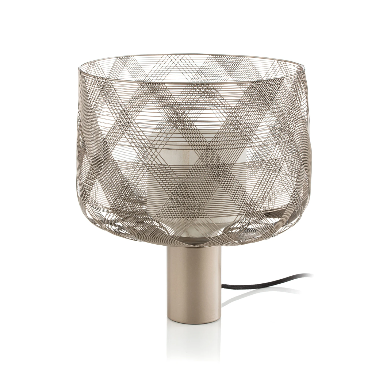 Geometrische, ineinander verschmelzende Formen charakterisieren die Tischleuchte Antenna M von Designer Arik Lévy. Der dank des metallenen Maschengewebes teils blickdichte und teils durchlässige Leuchtenschirm lässt ein faszinierendes Schauspiel aus Licht und Schatten entstehen. Trotzdem garantiert Antenna M eine weiche Lichtabstrahlung, da der Lichtschein durch den innenliegenden Textil-Diffusor sanft entblendet wird.