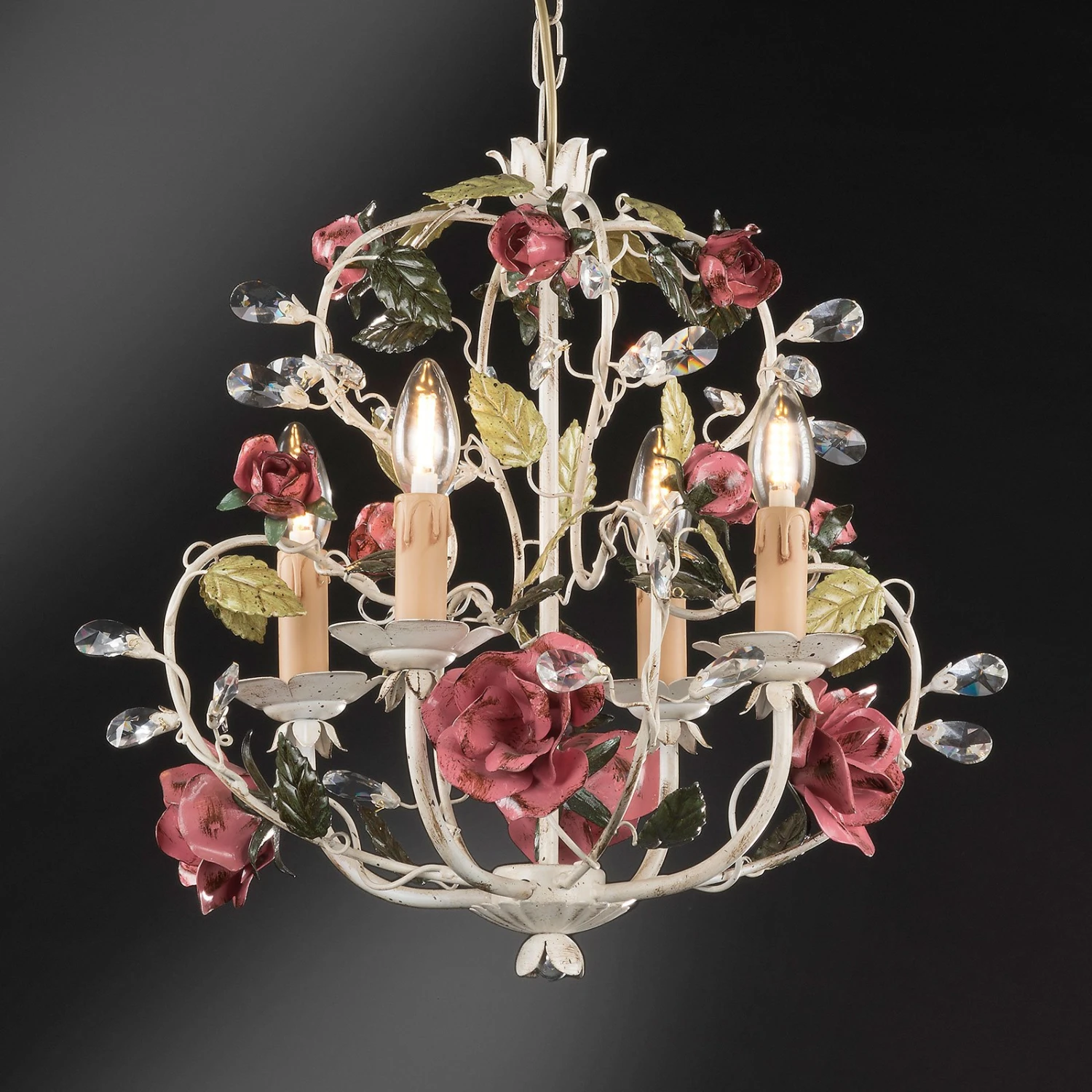 Der floral gestaltete und mit üppigem Rosendekor verzierte Kronleuchter Florenz ist der garantierte Glanzpunkt eines romantischen Einrichtungsstils. Mit der gelungenen Farbkombination wird die Hängeleuchte zum Blickfang und stellt ein Highlight in der Raumeineinrichtung dar. Das Licht von vier Lampen, mit denen die kerzenförmigen Halter bestückt werden können, bringt die klaren Kristalle eindrucksvoll zum Funkeln und lässt die roten Rosen samt ihrem Blattwerk erstrahlen. Das verzweigte Gestell ist in antik-weißem Ton gehalten.