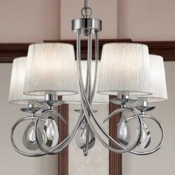 Bei der prächtigen Hängeleuchte Angelique sind es verschiedene Faktoren, die sie einzigartig schön machen. Da gibt es zum Einen die 5 schwungvoll miteinander verbundenen Chromarme der Leuchte mit einem schlaufenförmigen Ende und mit den krönenden Lampenschirmen aus Stoff, zum Anderen die in den Schlaufen der Arme platzierten Chrom-Glas-Tropfen, die der Hängeleuchte einen sehr wertvollen Charakter schenken. In den Schirmen sitzen die E14-Lampen, die für ein wohnliches Licht sorgen. Angebracht wird die Leuchte mit einer Kettenhalterung an der Decke, die das optische Bild noch vervollständigt.