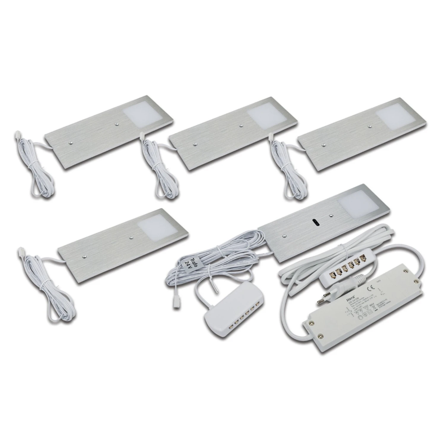 Fünf LED-Möbelunterbauleuchten Eco-Pad F mit gemeinsamer Stromversorgung und Bedienung über IR-Gestensensor