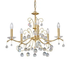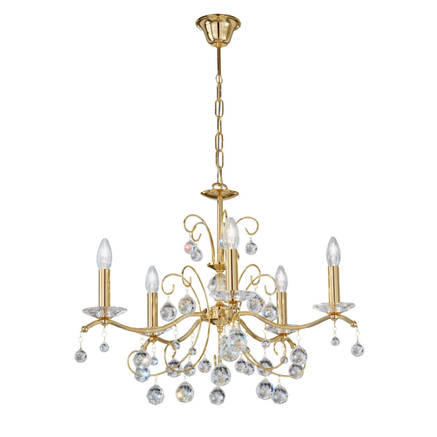 Das Kristallglas der Marke OPTIC® KOLARZ® Clear befindet sich an den fünf geschwungenen Armen des Kronleuchters einerseits als dekoratives Element und andererseits als Schüssel, auf der die vergoldeten Kerzenhalter angebracht sind. Das Zusammenspiel von Gold und Kristall ist nicht nur edel, sondern verleiht jedem Raum das gewisse Etwas.