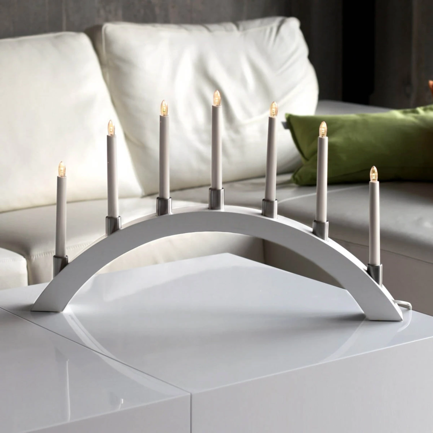 Das Besondere an diesem Lichterbogen ist, dass die sieben Kerzen mit LED-Leuchtmitteln ausgestattet sind, so dass der gesamte Lichterbogen insgesamt nur 0,7 Watt benötigt. Sparsamer und schöner kann Weihnachtsbeleuchtung kaum sein!