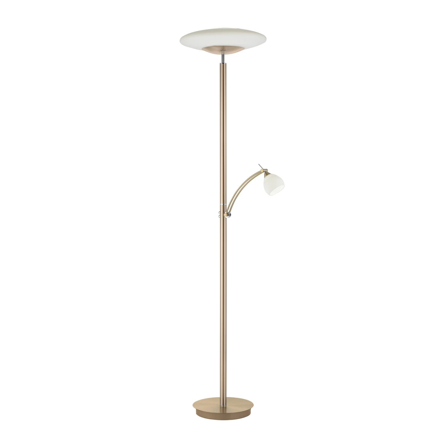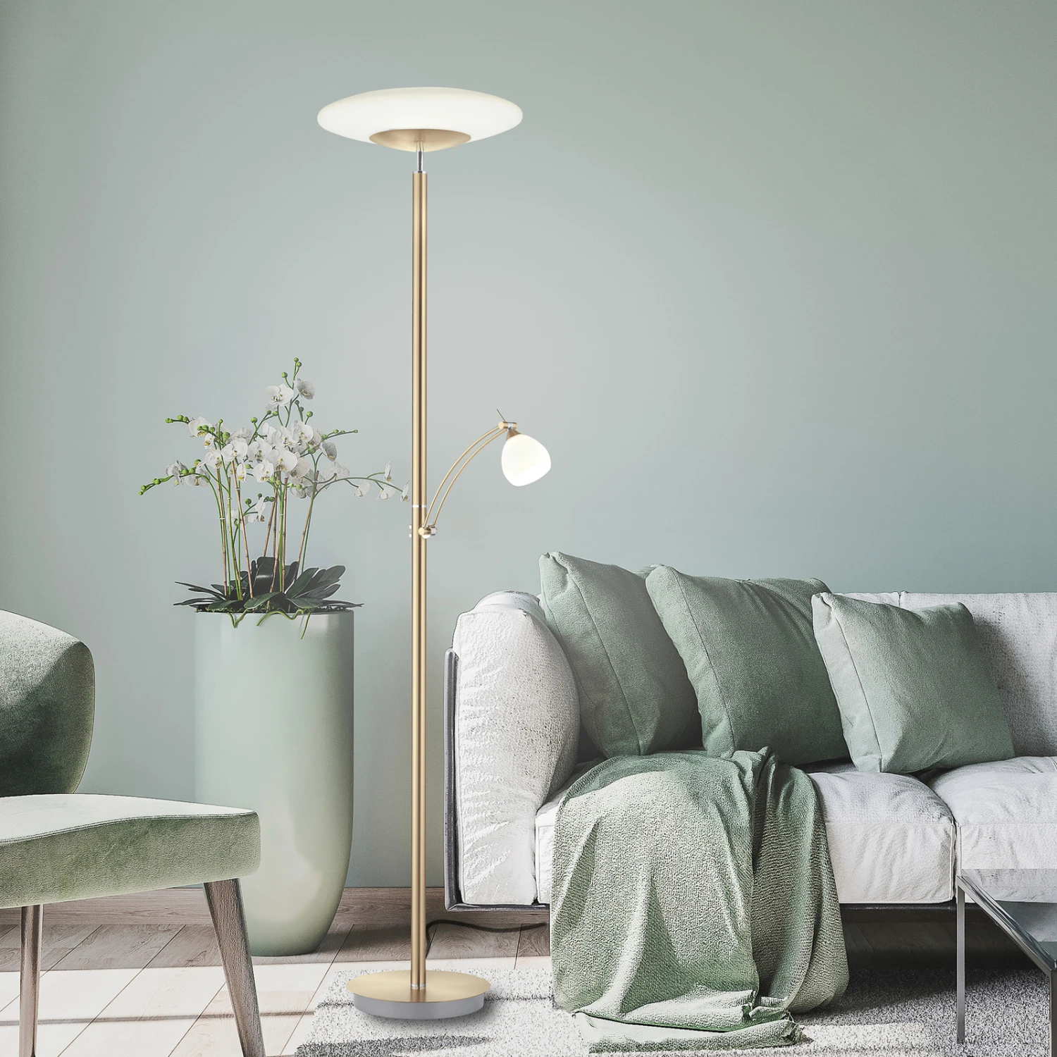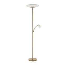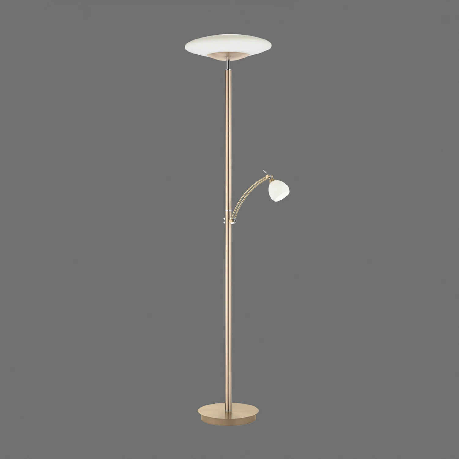 Troja ist eine zeitlos gestaltete Stehleuchte mit funktionalem Charakter und effizienter LED-Technik. Ihr Gestell ist aus robustem Eisen gefertigt. Die beiden Lampenschirme sind jeweils aus opalem Glas. Während die obere Lichtquelle als Fluter fungiert und den Raum dezent und blendfrei beleuchtet, sorgt der Lesearm für gezielte Beleuchtung. Der Lesearm ist dreh- und schwenkbar, wodurch sich das Licht dorthin lenken lässt, wo man es benötigt.