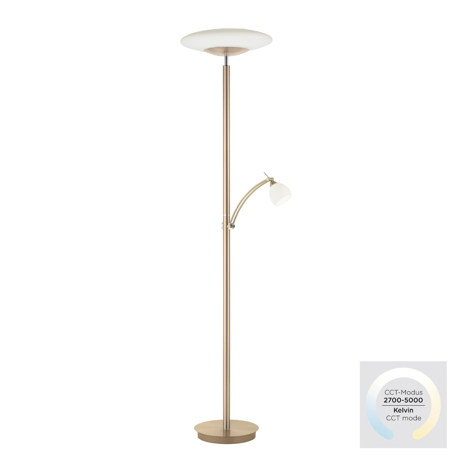Die beiden Lichtquellen der LED-Stehleuchte sind einfach über die beiden Schalter bedienbar. So lassen sie sich mühelos dimmen und bei Doppelklick auf den jeweiligen Schalter wird zum CCT-Modus gewechselt und die Lichtfarbe lässt sich von warmweiß bis universalweiß einstellen.