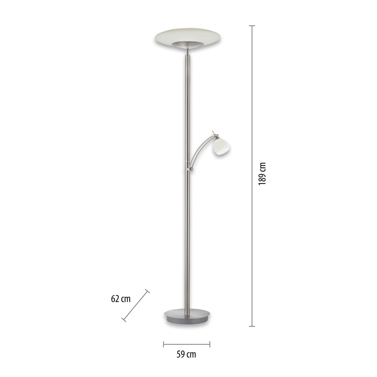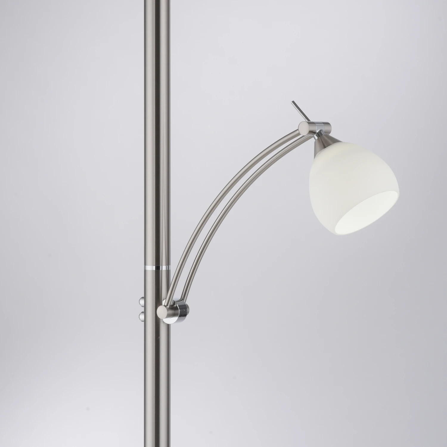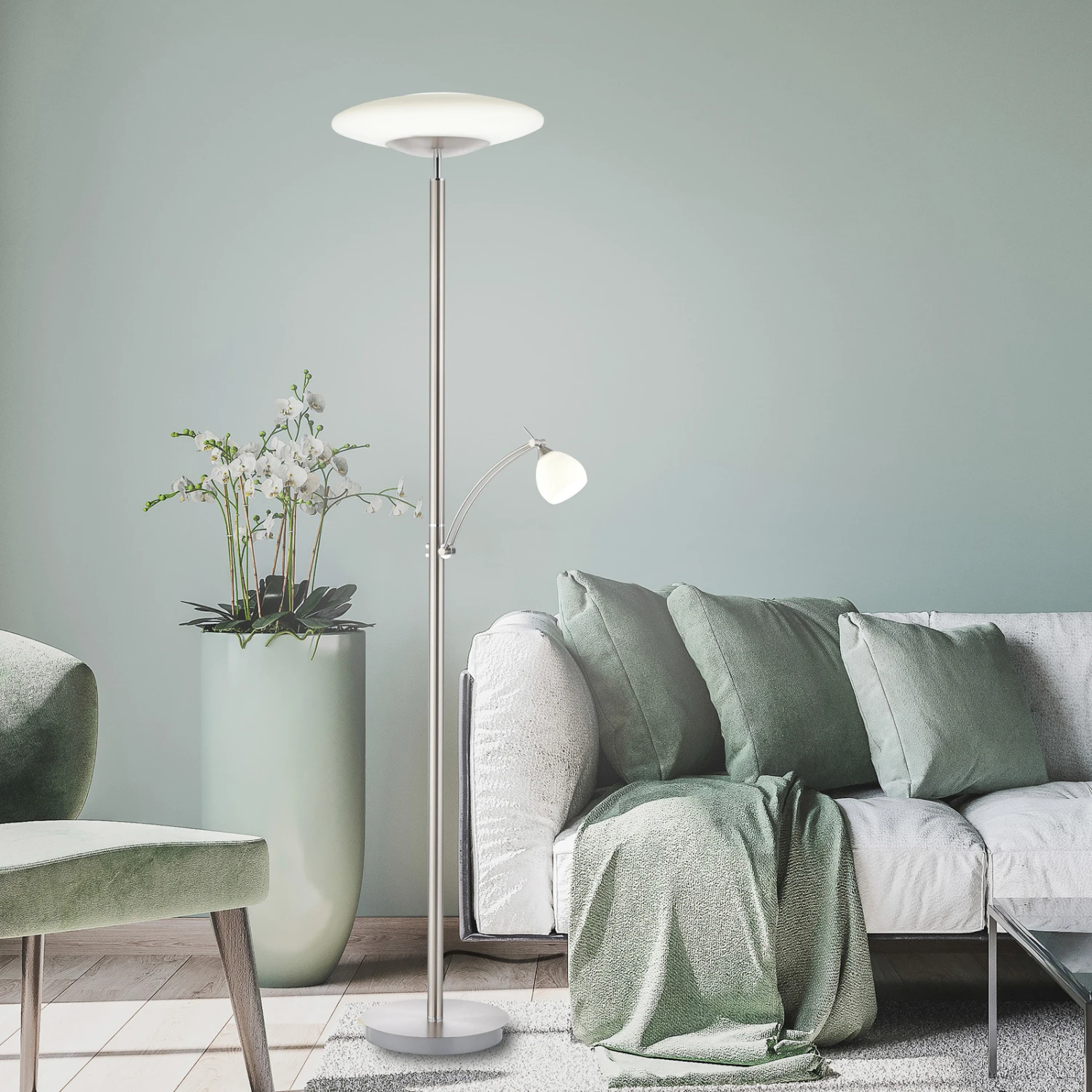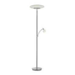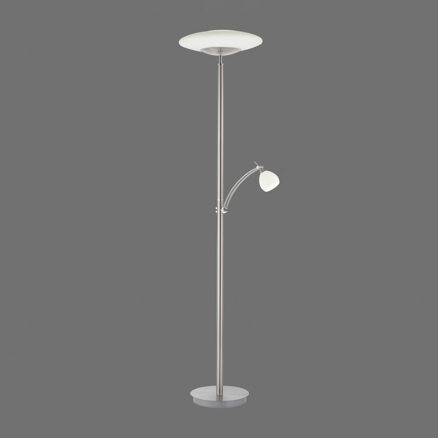 Troja ist eine zeitlos gestaltete Stehleuchte mit funktionalem Charakter und effizienter LED-Technik. Ihr Gestell ist aus robustem Eisen gefertigt. Die beiden Lampenschirme sind jeweils aus opalem Glas. Während die obere Lichtquelle als Fluter fungiert und den Raum dezent und blendfrei beleuchtet, sorgt der Lesearm für gezielte Beleuchtung. Der Lesearm ist dreh- und schwenkbar, wodurch sich das Licht dorthin lenken lässt, wo man es benötigt.