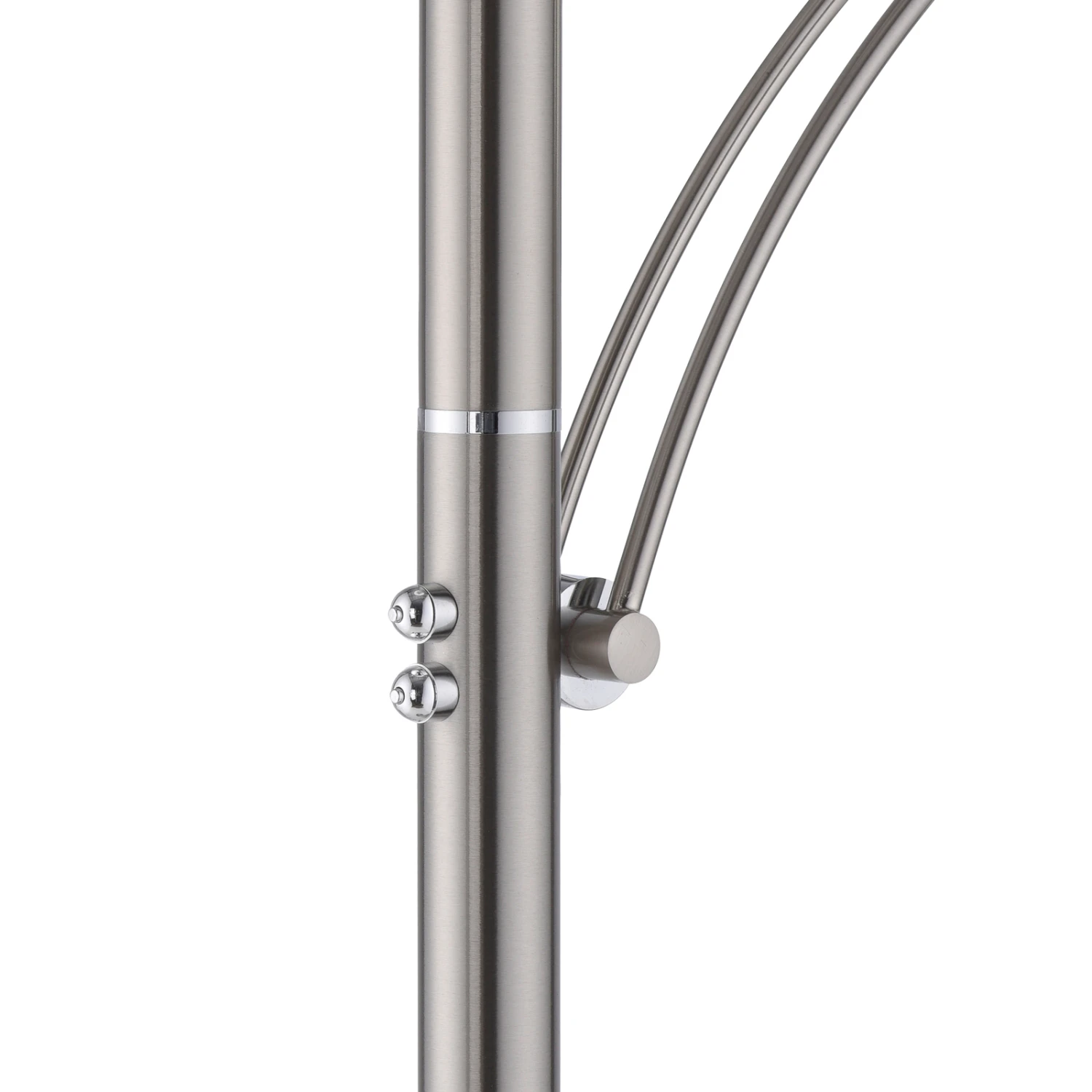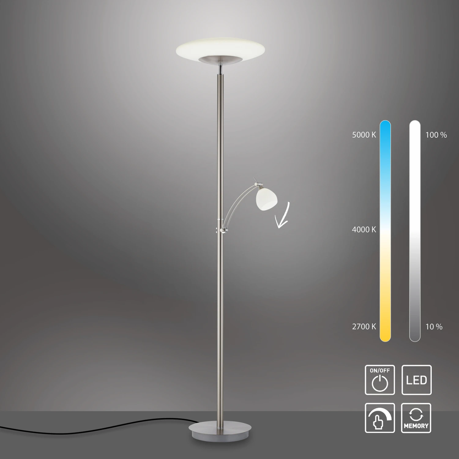 Die beiden Lichtquellen der LED-Stehleuchte sind einfach über die beiden Schalter bedienbar. So lassen sie sich mühelos dimmen und bei Doppelklick auf den jeweiligen Schalter wird zum CCT-Modus gewechselt und die Lichtfarbe lässt sich von warmweiß bis universalweiß einstellen.