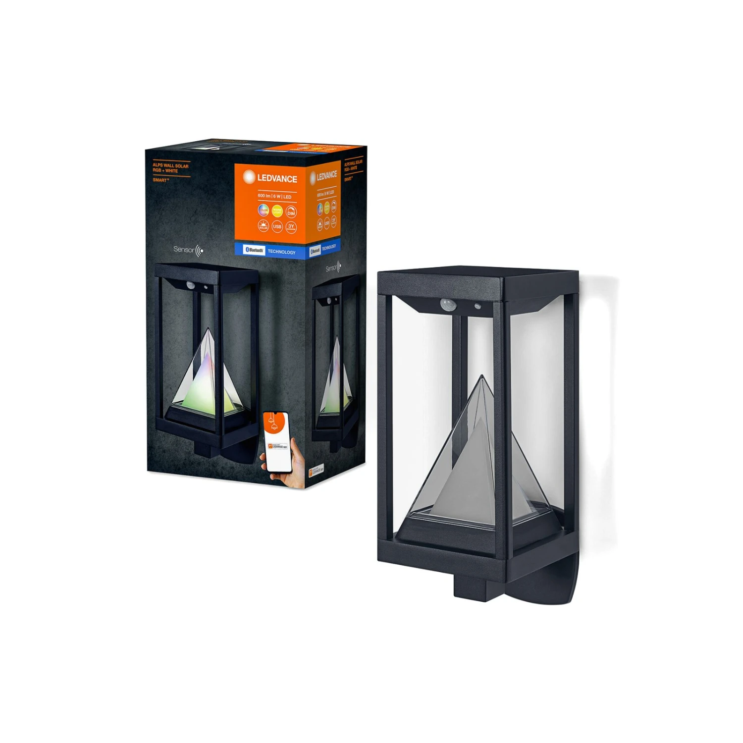 Aus Aluminium und Polycarbonat als moderne Laterne wurde die solarbetriebene LED-Außenwandleuchte Alps Multicolor gefertigt. Sie ist mit Bewegungs- und Tageslichtsensor ausgestattet und spendet bedarfsgerechte Beleuchtung. Farbiges oder warmweißes Licht in regelbarer Helligkeit kann nach der Koppelung via Bluetooth per App oder Sprachbefehl gesteuert werden. Die Solarleuchte ist schnell und einfach installiert und vereint die Funktionalität von Allgemeinbeleuchtung und Stimmungsbeleuchtung.