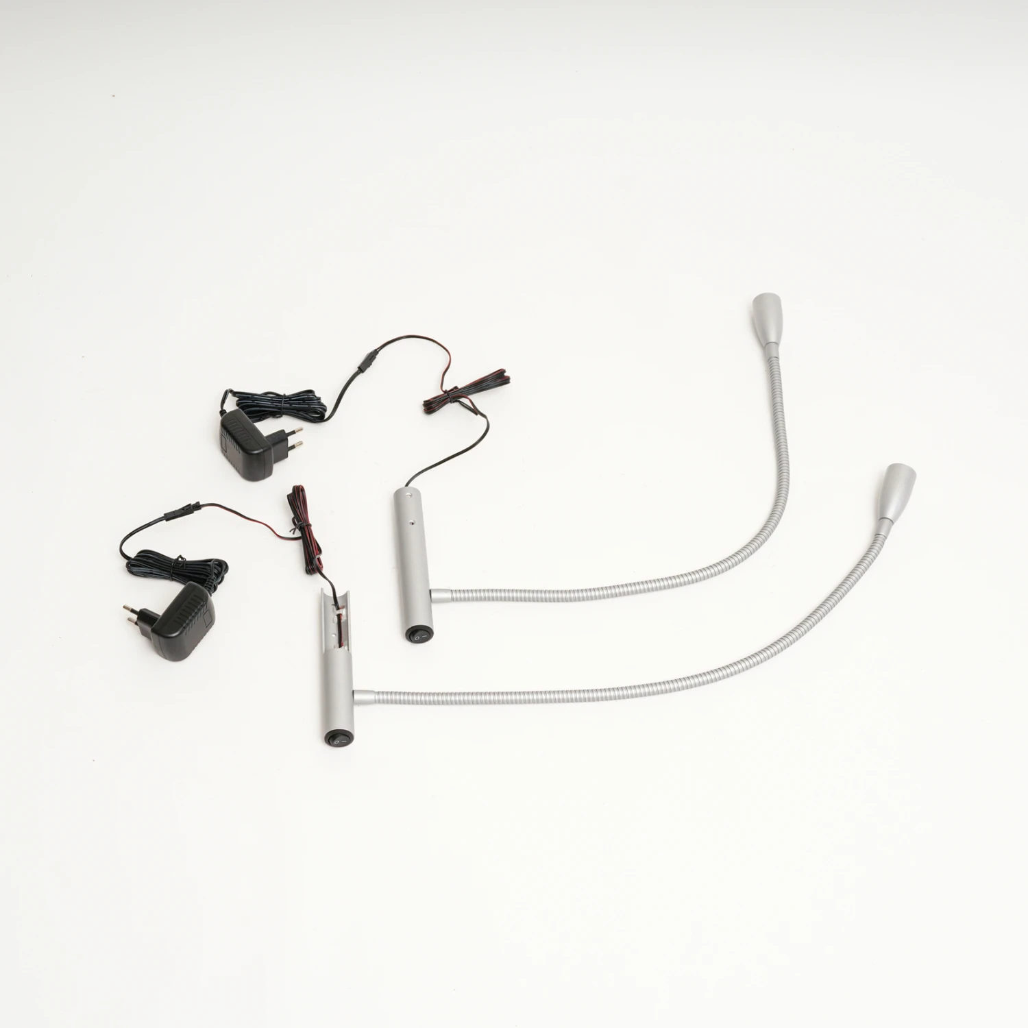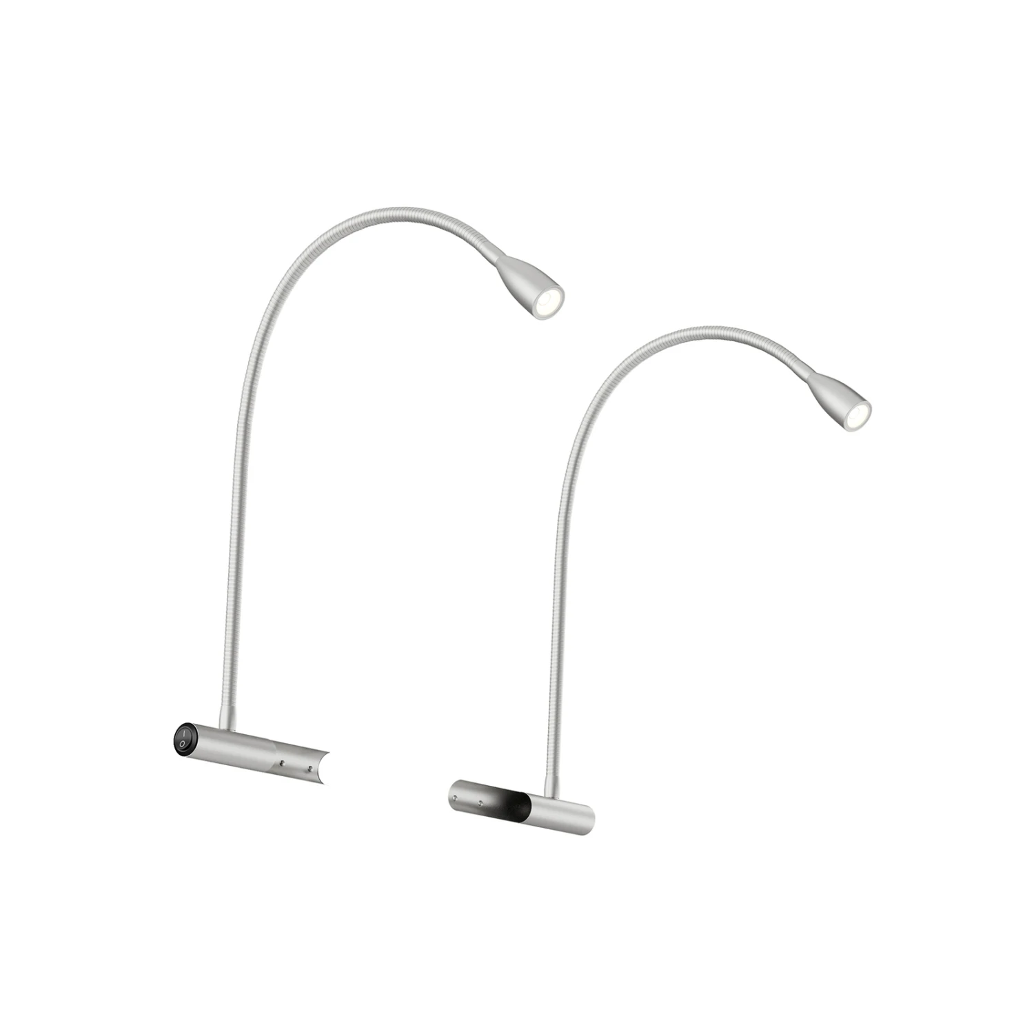 Schlanke LED-Aufbauleuchte Apolonia im praktischen 2er-Set Die LED-Aufbauleuchte Apolonia ist vielseitig und lässt sich mühelos auf Möbel aufbauen. Sie besteht aus Aluminium und Kunststoff und ist in einem dezenten Silber gehalten. Ihr kompakter Leuchtenschirm sitzt an einem Flex-Arm, der sich je nach Belieben ausrichten lässt und immer für die richtige Ausleuchtung sorgt. An dem Fuß der LED-Aufbaulampe Apolonia ist ein Kippschalter angebracht, mit dem die Leuchte mühelos ein- und ausgeschaltet werden kann. Die Leuchte ist mit Hilfe eines schmalen Kabels mit dem Strom verbunden, welches eine flexible Platzierung und Umpositionierung gestattet. Darüber hinaus kommt sie in einem praktischen 2er-Set, was die Gestaltung eines stimmigen Gesamtbildes möglich macht.