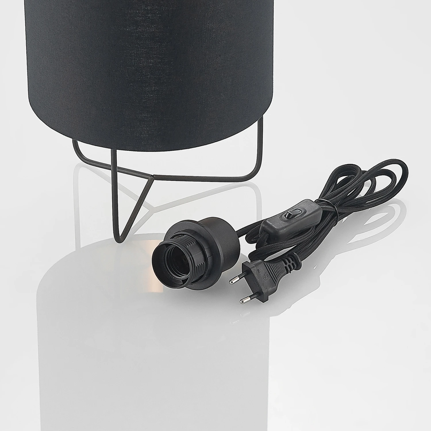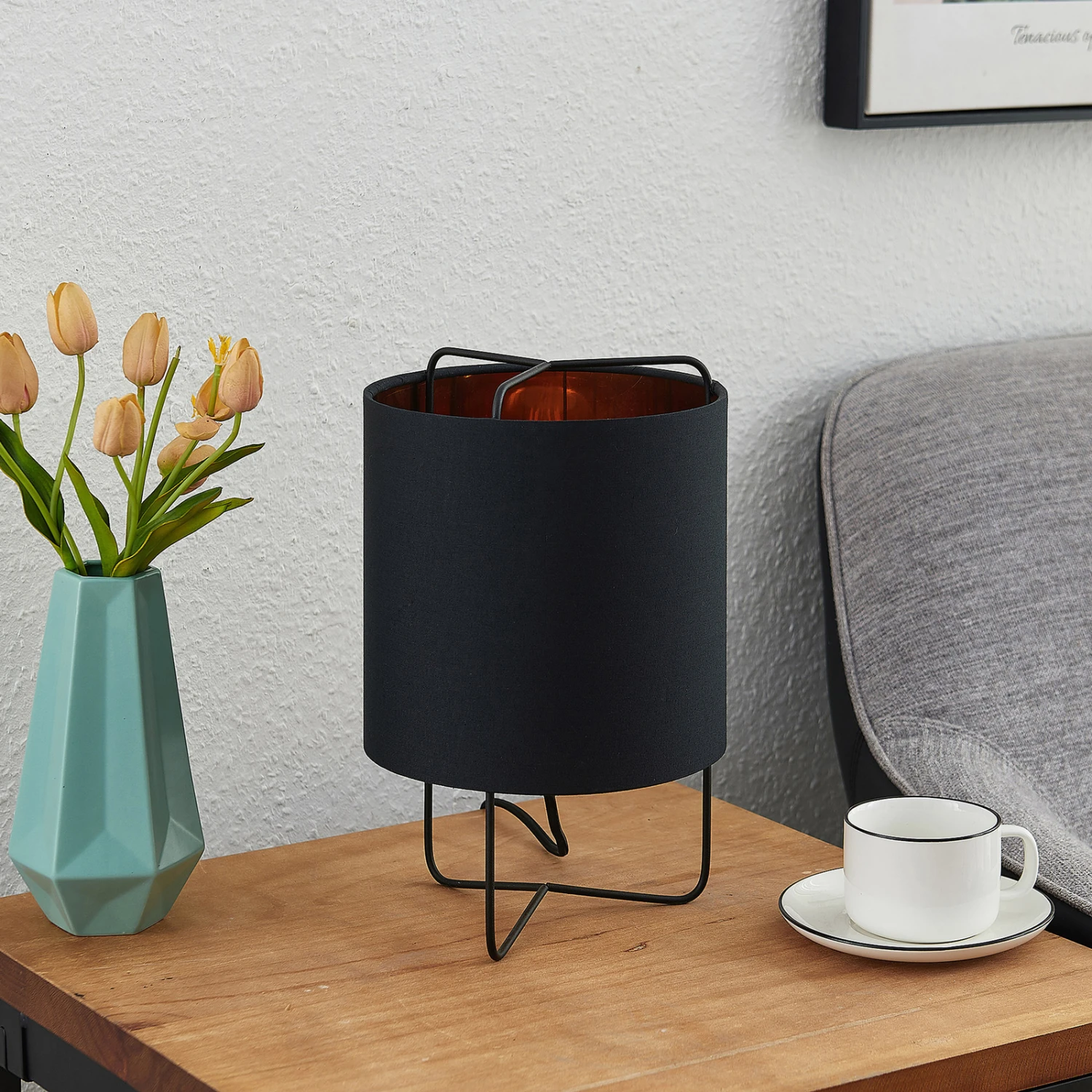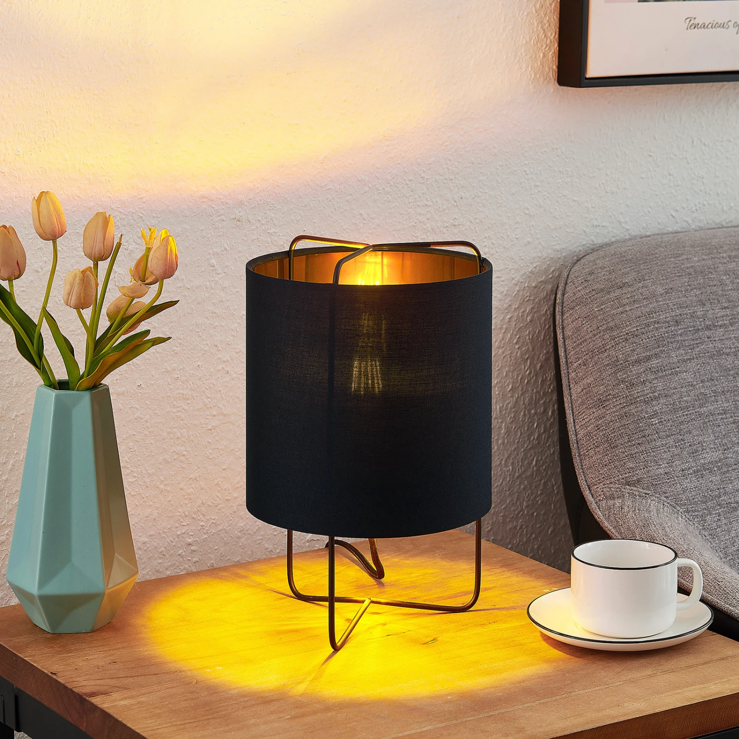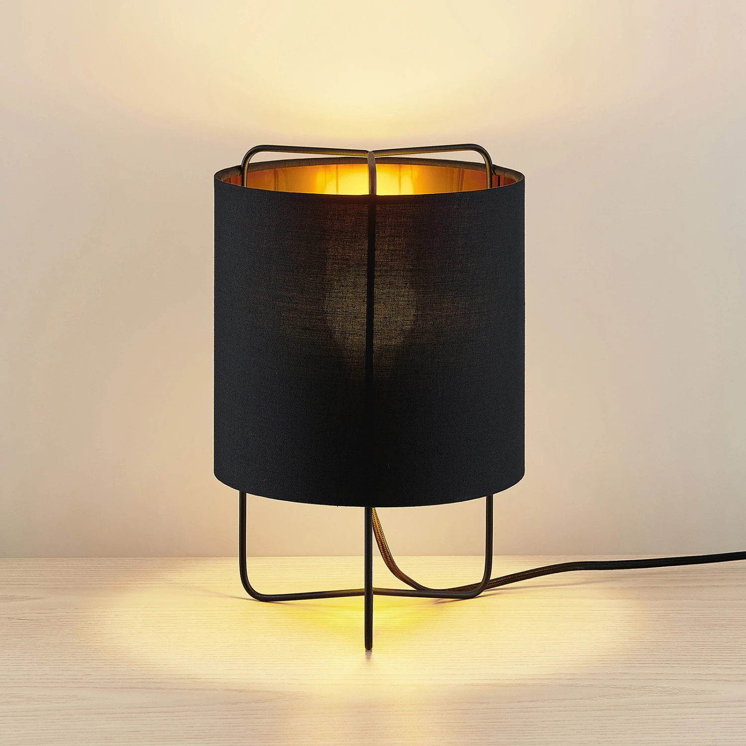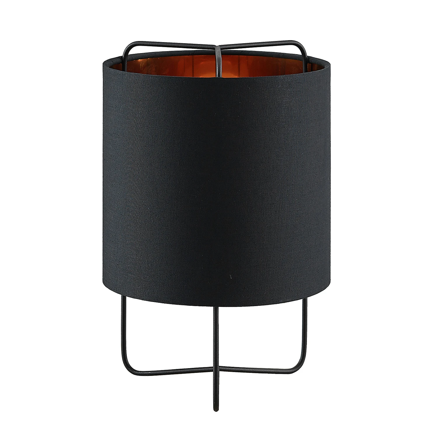 Kesta ist eine Tischlampe, die super zu modernem, stilvollem oder leicht jugendlichem Interieur passt. Der aus Stoff bestehende Lampenschirm ist rund und schwarz, die Innenseite jedoch golden getönt. So ergibt sich nicht nur ein harmonischer Farbkontrast, sondern auch eine wohnliche Lichtwirkung, weil der Goldton das von der E27-Lampe ausgesendete Licht so schön warm reflektiert. Insgesamt kann man von gedämpftem Lichtschein mit einer gemütlichen Wirkung ausgehen, denn der schwarze Schirm sorgt dafür, dass weniger Licht direkt nach außen tritt. Das Steckerkabel verfügt über eine Schalter und das Gestell besteht aus drei schmalen, filigranen Stäben, die unten zusammengeführt werden und gemeinsam wie eine Art Rahmen wirken.
