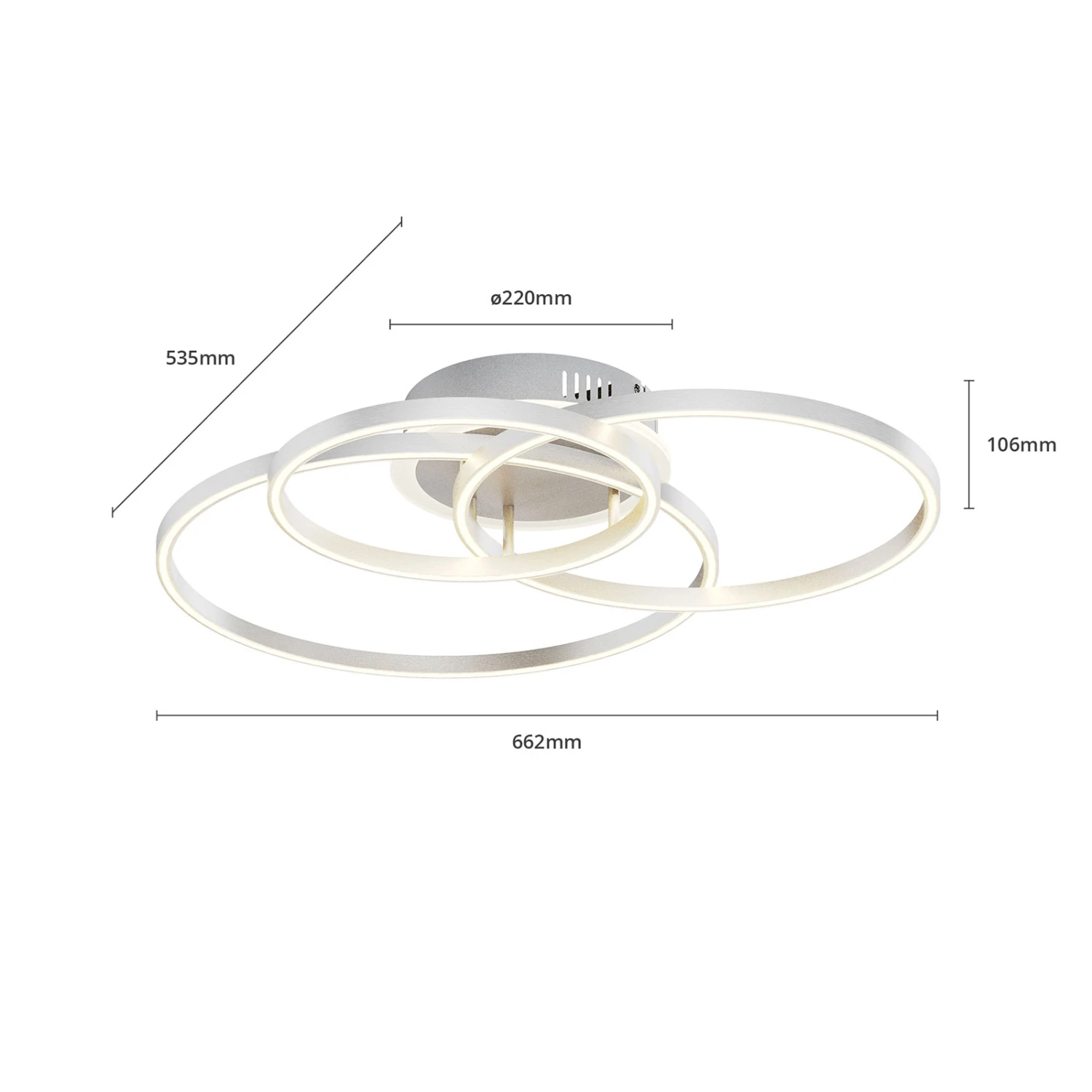 Unterschiedlich große Kreise bilden hier das Grundelement der modernen LED-Deckenleuchte Tula. Sie bietet für Wohnzimmer oder Flur eine zuverlässige Raumbeleuchtung, die zudem dimmbar und in der Lichtfarbe änderbar ist.