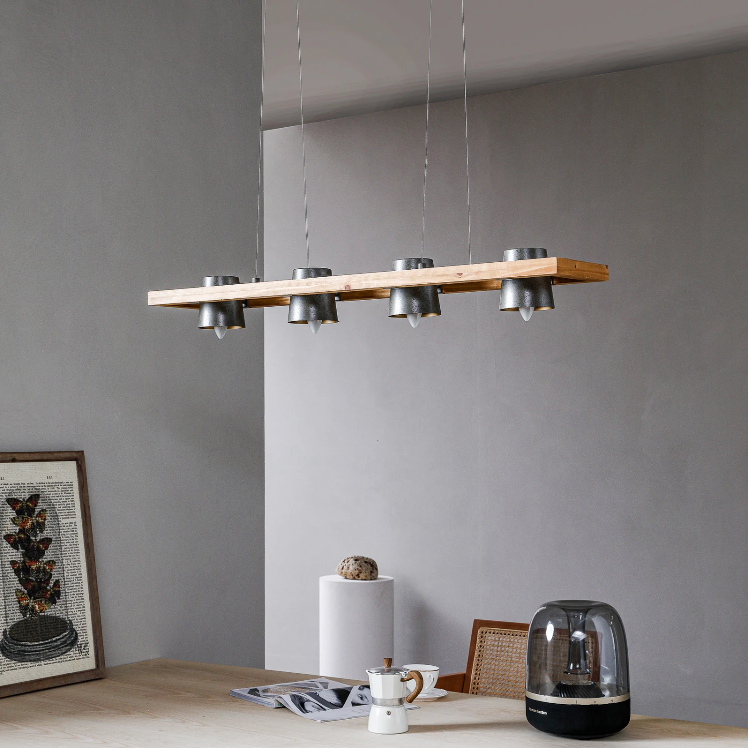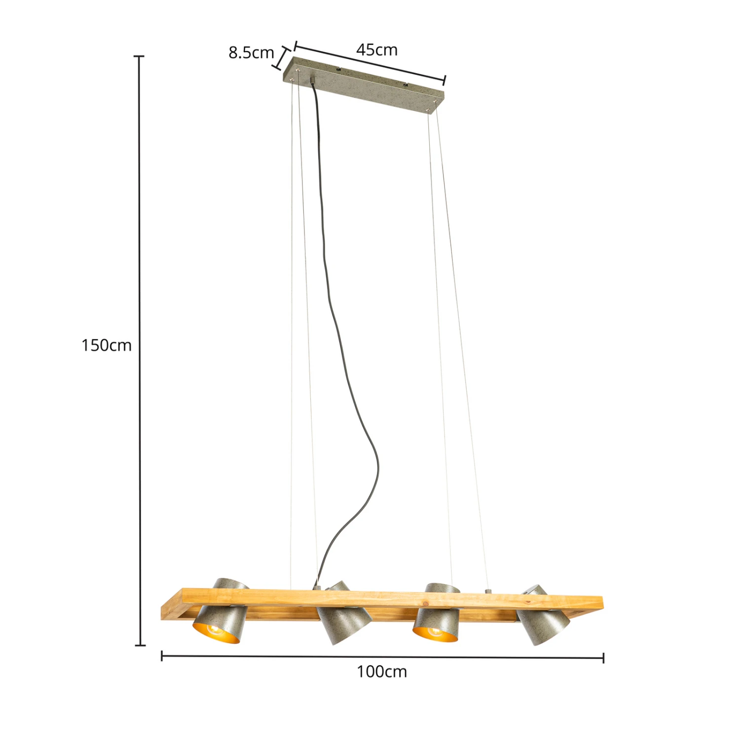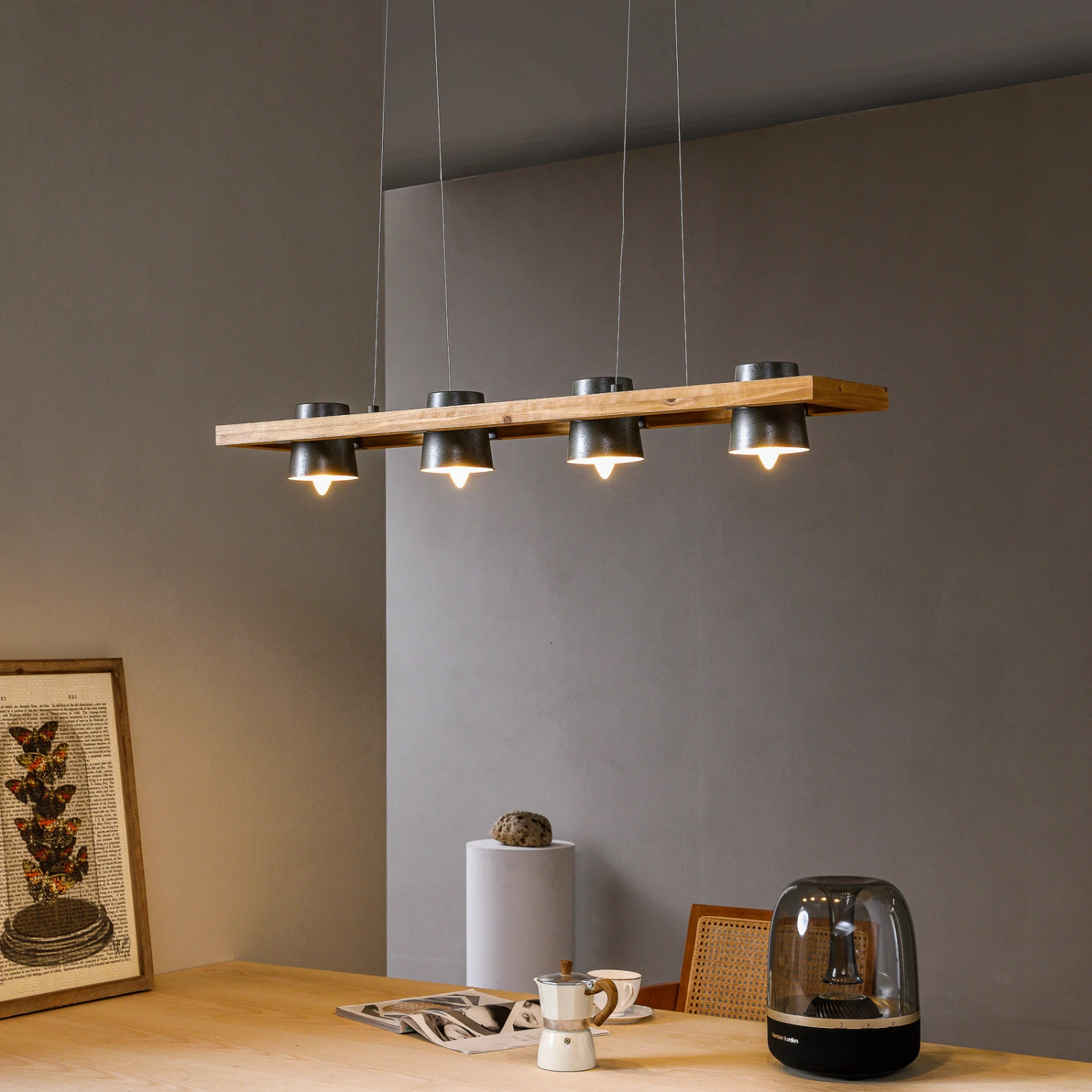 Vierflammige Pendelleuchte Thimea aus Metall und Holz