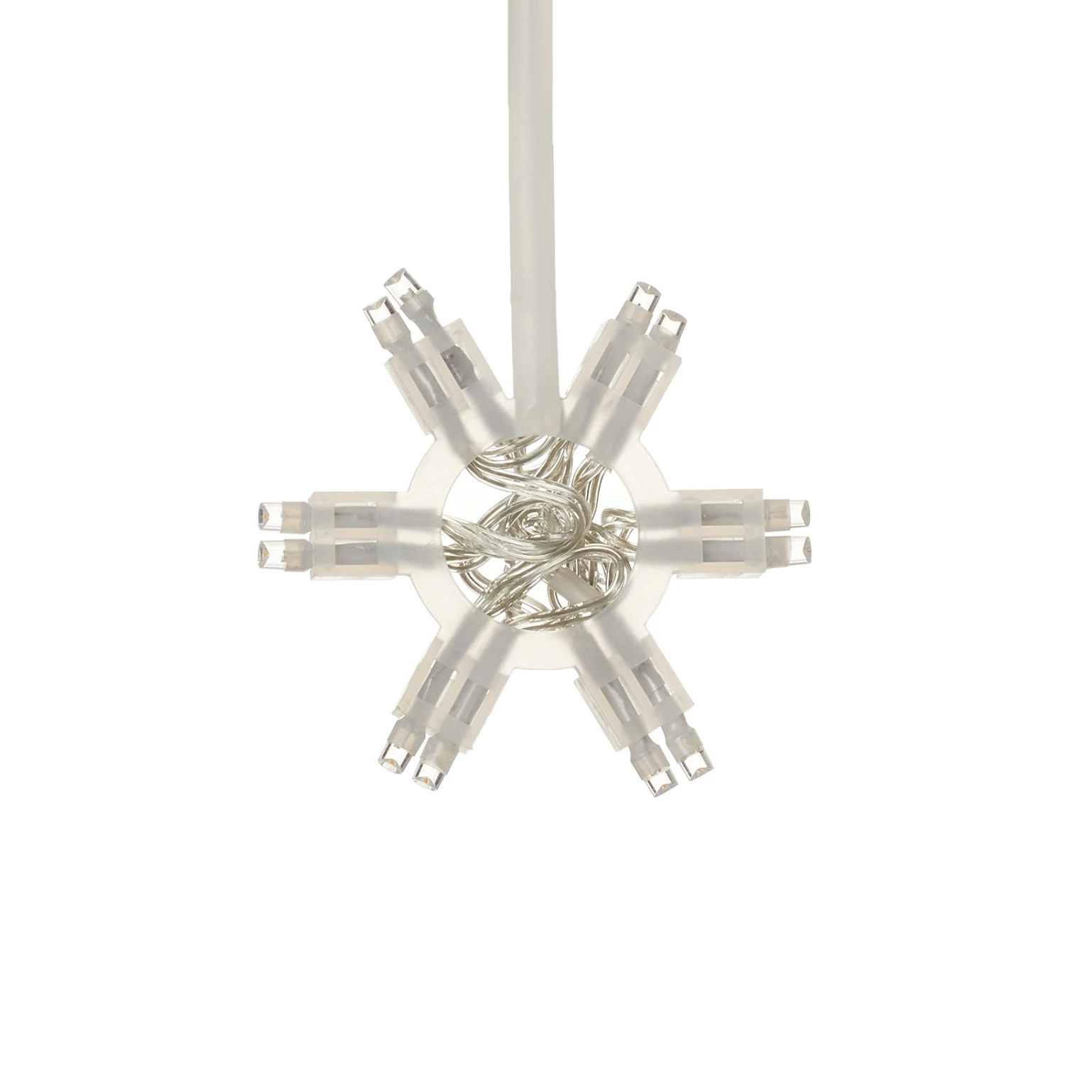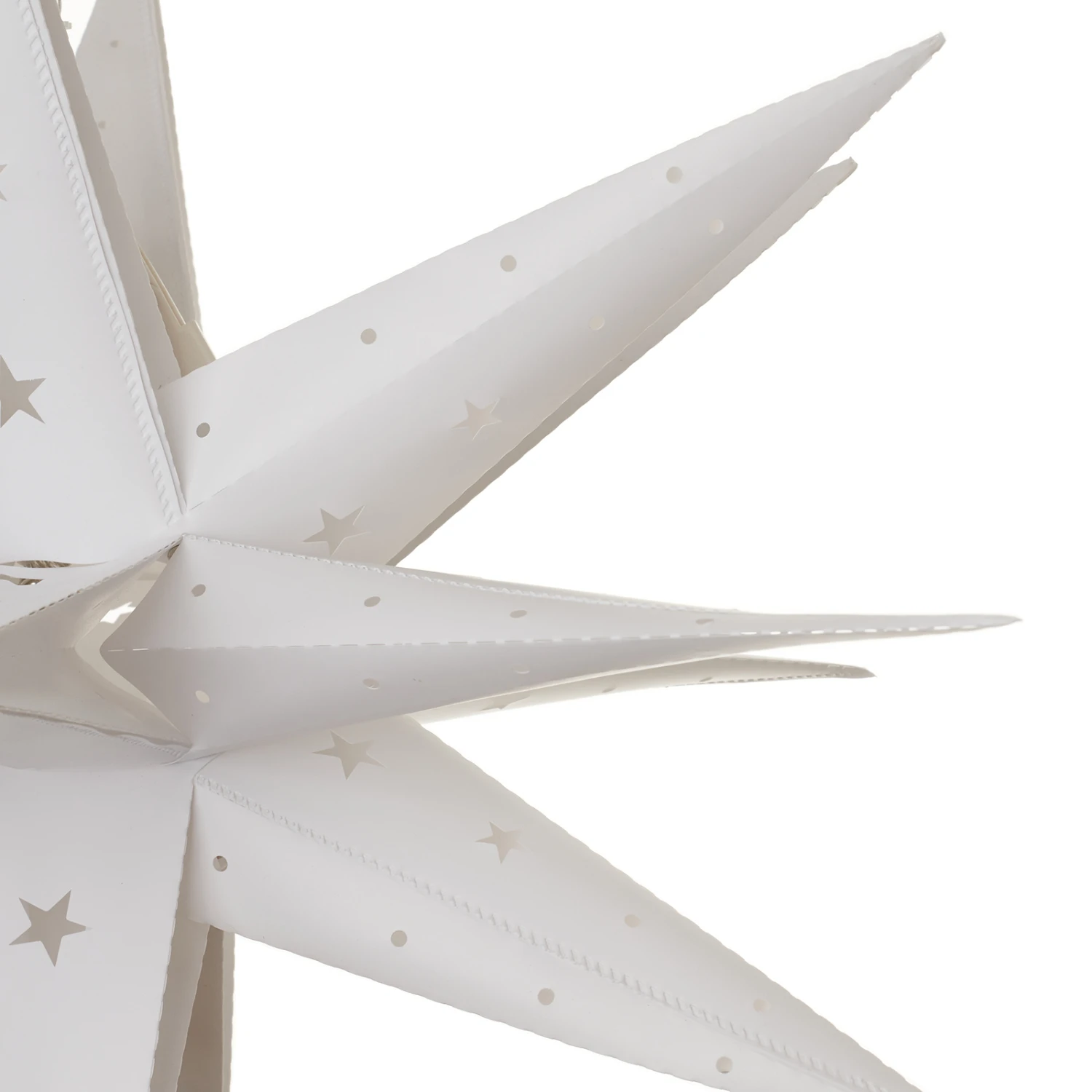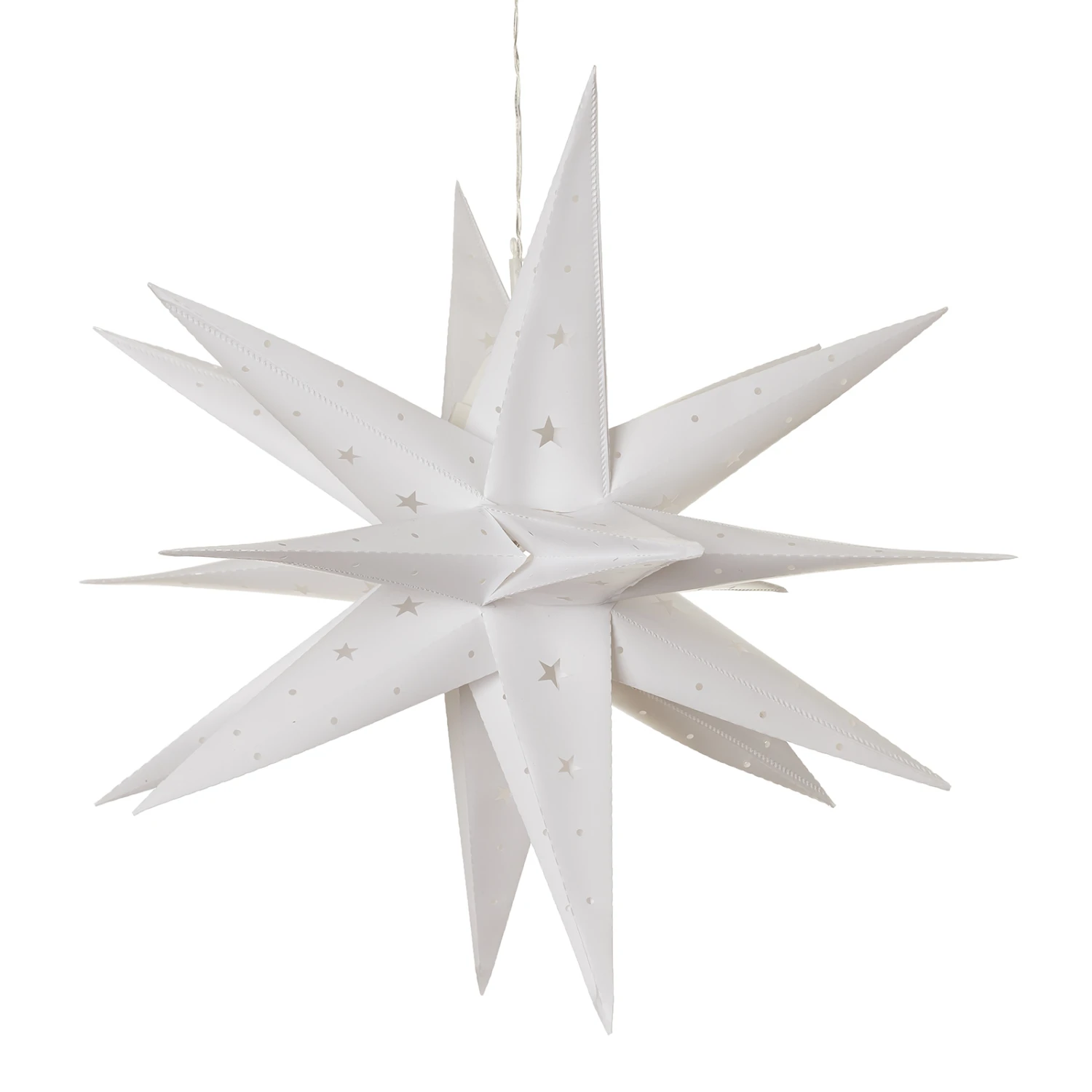 Dieser vielzackige Dekostern mit integrierter LED-Beleuchtung wird viele Bewunderer finden. Er eignet sich hervorragend als Fensterschmuck von außen und sieht z. B. auch vom Dachfirst hängend wundervoll aus. In den weißen Kunststoffschirm ist ein Lochmuster eingearbeitet, das warmweiße Licht der verbauten Leuchtdioden dringt durch die Ausstanzungen und erhellt sanft die dunkle Nacht.
