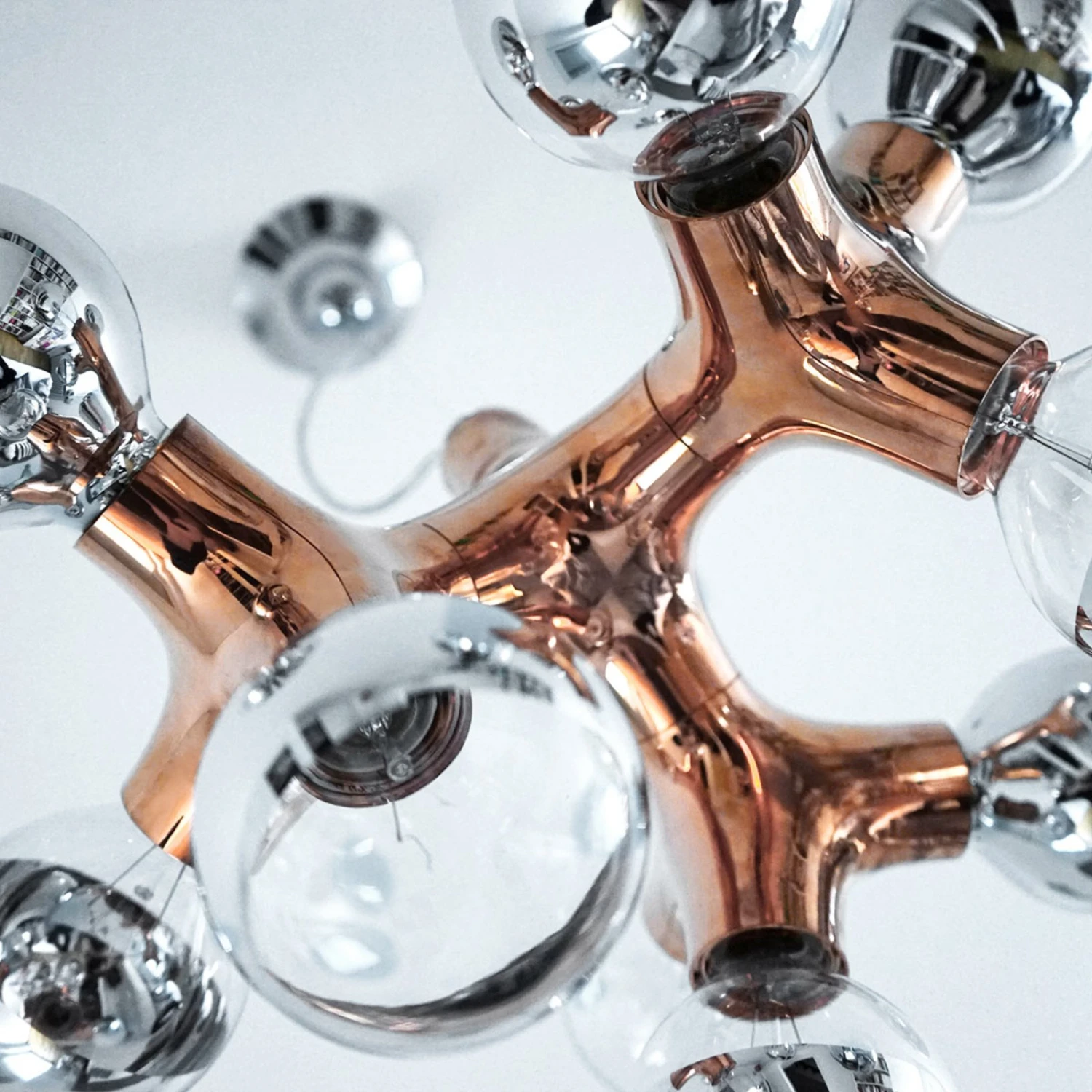 Fernab dessen, was man bei der Optik eines Kronleuchters erwartet, präsentiert sich das Kronleuchter-Modell aus der Leuchtenserie DNA als untypisches Beispiel für seine Kategorie. Statt gerader, nach oben gerichteter Leuchtkerzen mit Schirmchen ist DNA Chandelier mit insgesamt neun Lichtstellen in Form von Globe-Leuchtmitteln (exklusive) ausgestattet, die alle in verschiedene Richtungen zeigen. Dies ist dem Design geschuldet, das sich Hopf & Wortmann, die Designer von DNA, für ihre Kreation ausgedacht haben.