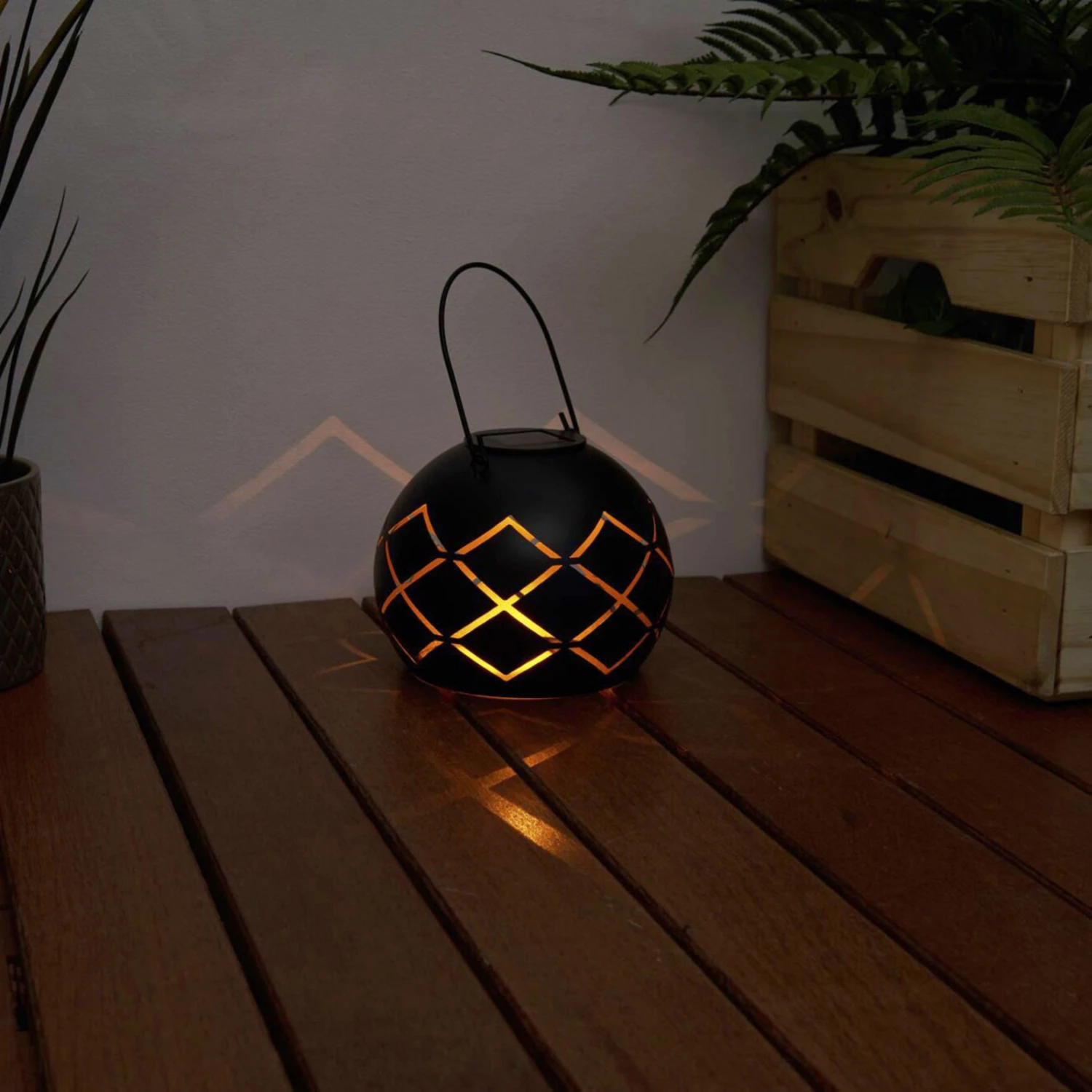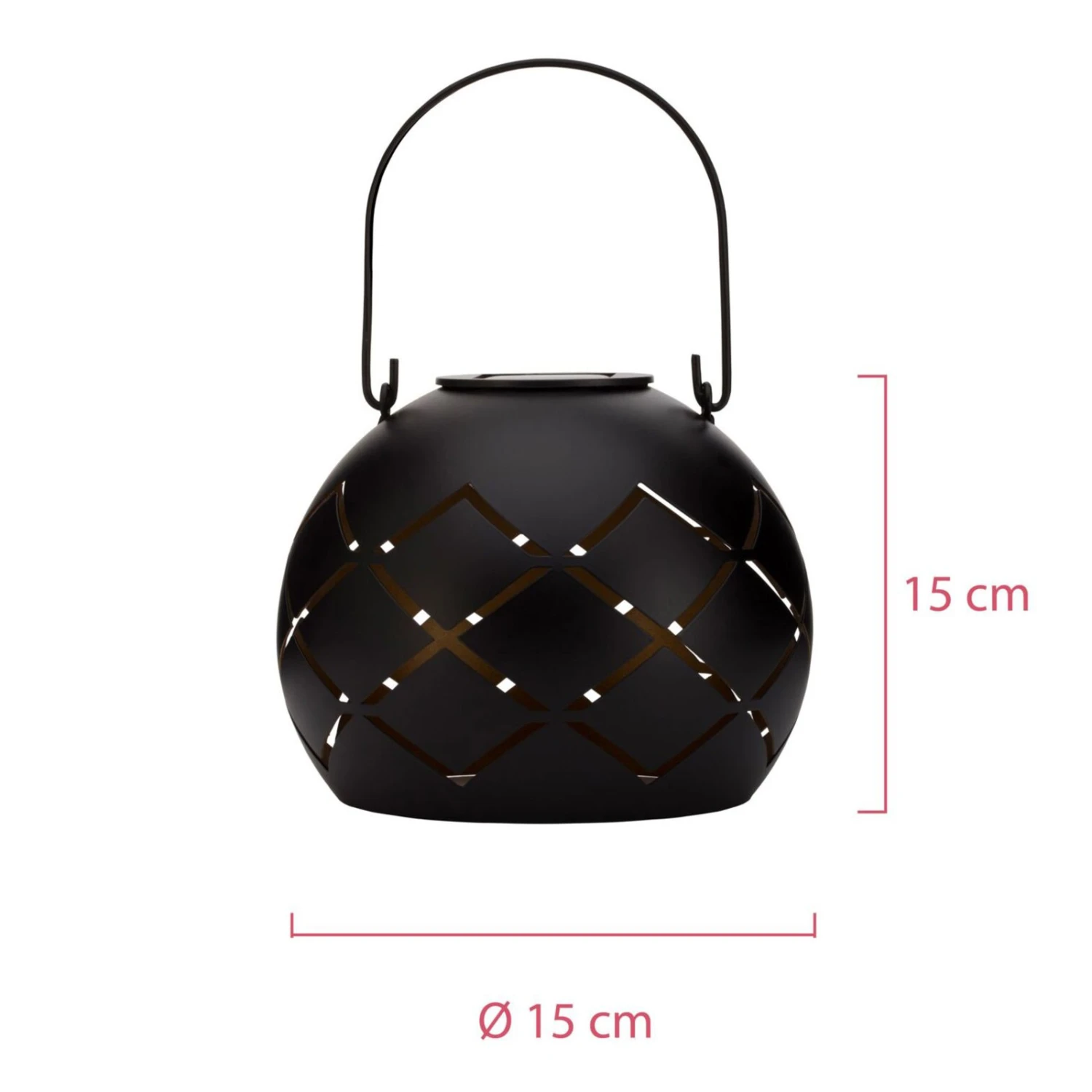 Die Solar-Laterne Sunshine Cheer bringt wundervolle Lichteffekte in lange Sommernächte. Die Solar-Laterne lädt sich tagsüber im Sonnenlicht auf. Bei Dämmerung schaltet sich das Licht automatisch ein. Die Leuchtdauer beträgt bis zu 8 Stunden täglich. Sunshine Cheer schafft gemütliche Stimmung auf dem Balkon oder im Garten. Die schwarze Solarlampe aus hochwertigem Metall begeistert mit einer interessanten Struktur, durch die die Lichtstrahlen nach außen dringen. Die goldene Innenbeschichtung zaubert extra schönes, warmes Licht. Mit dem Griff lässt sich die Leuchte auch in Bäumen oder an Überdächern einfach aufhängen. Solarleuchten benötigen keine Montage bzw. Kabel und haben einen austauschbaren Akku.