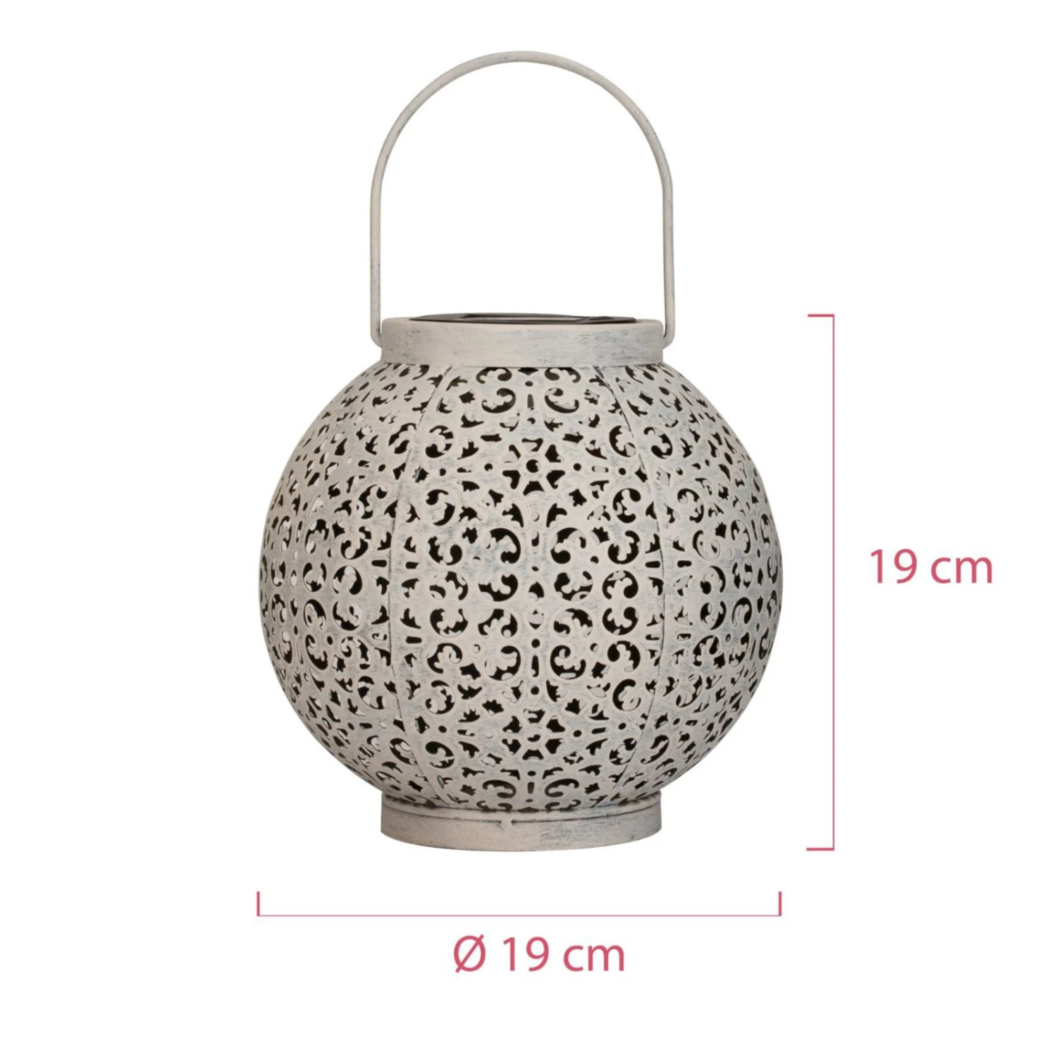 Die Solar-Laterne Sunshine Jewel mit ihrer weißen Vintage-Oberfläche zaubert romantische Lichteffekte in den Außenbereich. Das Solarpanel lädt sich tagsüber im Sonnenlicht auf und wird abends automatisch eingeschaltet. Der inkludierte Akku bietet eine Leuchtdauer von bis zu 8 Stunden täglich. Die goldene Innenbeschichtung des Metallkonstrukts lässt das Licht besonders warm wirken. Mit dem Henkel lässt sich die Leuchte auch in Bäumen oder an Überdächern anbringen.