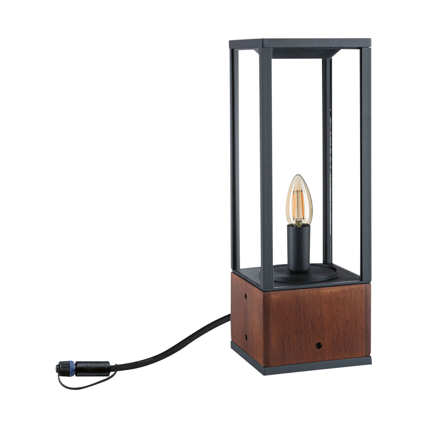 Eine geradlinige Quaderform und die Kombination aus schwarzem Metall und Holz machen die LED-Sockelleuchte Venea zum Blickfang in jedem Außenbereich. Mittig in der Laterne sitzt das LED-Leuchtmittel, das optisch wie eine Kerzenlampe in einer Fassung wirkt. Die Sockelleuchte Venea aus der Reihe Plug & Shine von Paulmann lässt sich sehr gut zu mehreren Leuchten kombinieren, um Wege, Eingangsbereiche, Terrassen etc. effektvoll zu beleuchten und kann auch mit anderen Leuchten und weiterem Zubehör der Reihe kombiniert werden, um eine komplette Außenbeleuchtung zu realisieren.