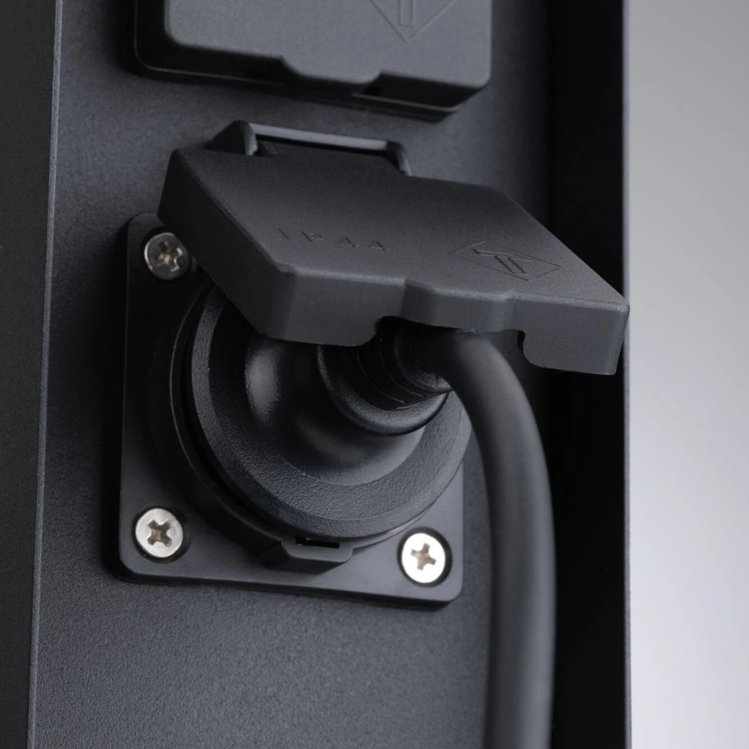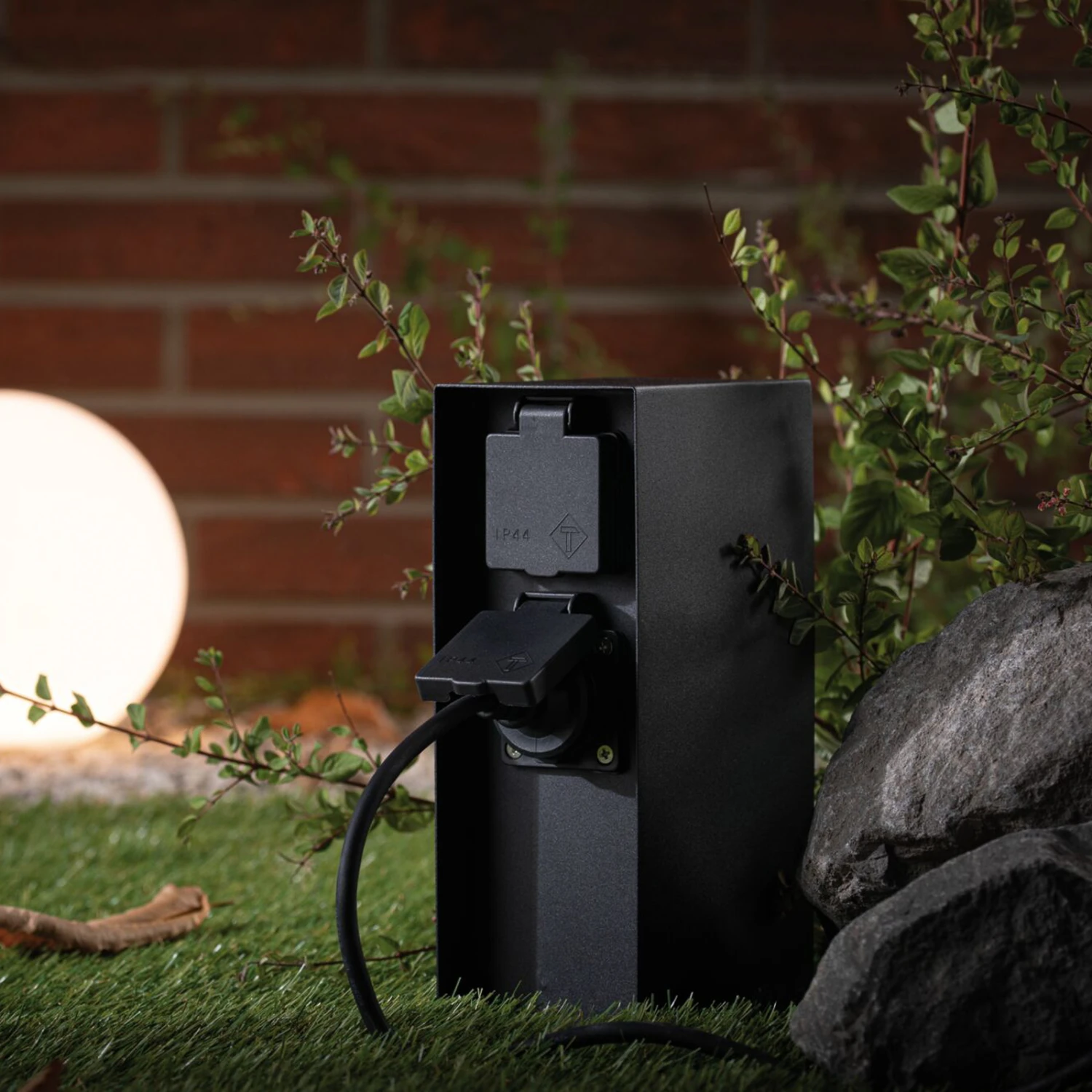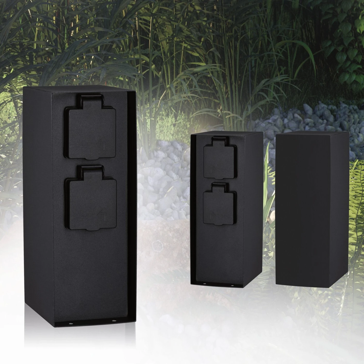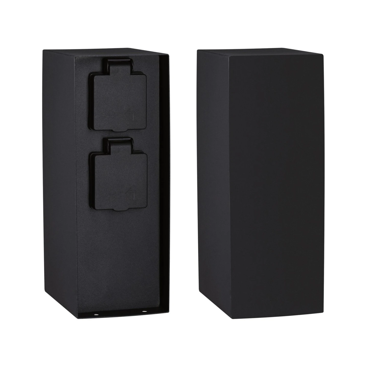 Aus anthrazitfarben beschichtetem Metall wurde die Steckdosensäule Rio gefertigt, die mit zwei Schuko-Steckdosen Anschlussmöglichkeiten für elektrische Geräte oder Leuchten im Außenbereich bietet.