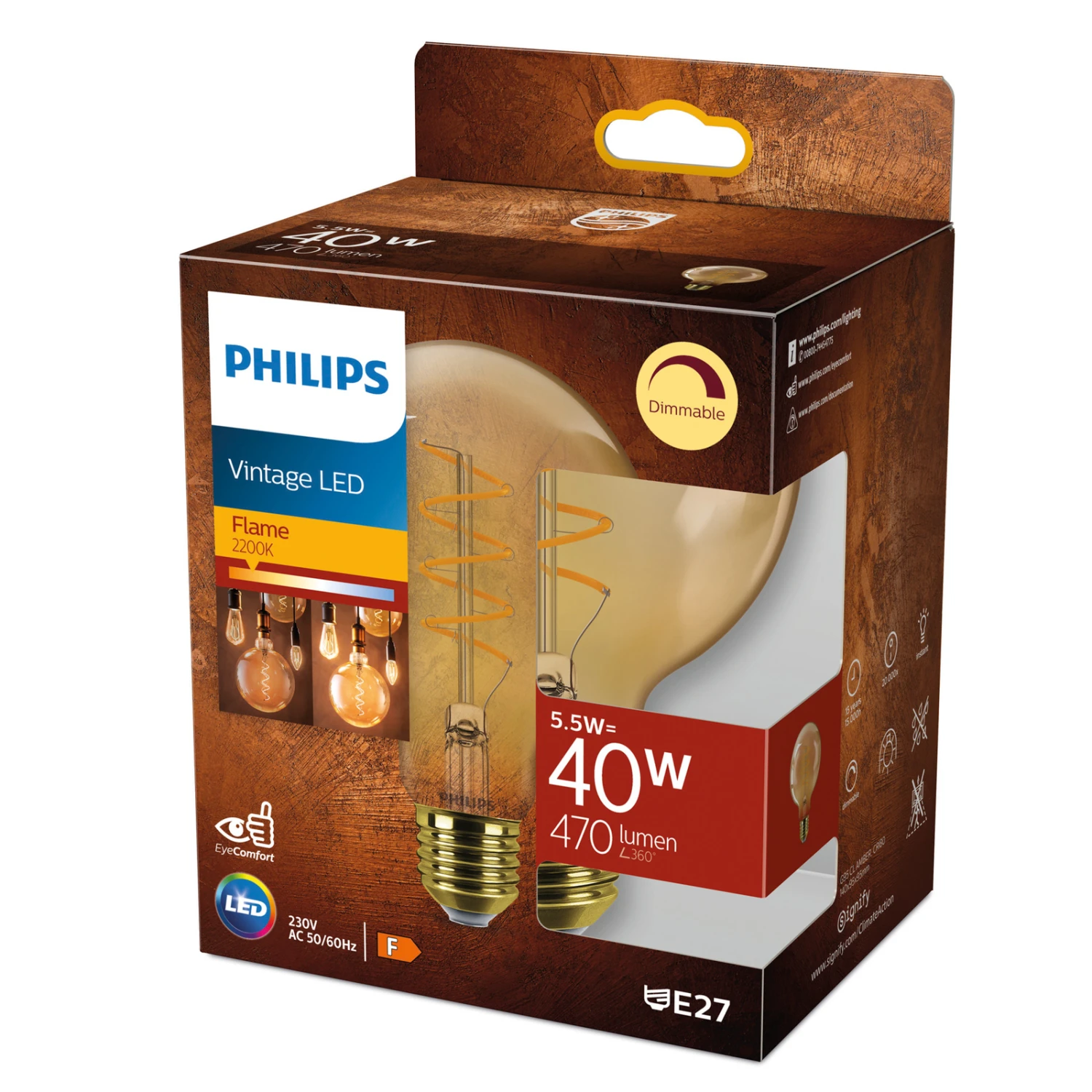Diese dimmbare 5,5 W E27 LED-Filament-Globelampe mit Durchmesser 9,5 cm und goldener Glastönung bietet extra warmweißes Licht und dient als langlebiger, energieeffizienter Ersatz für herkömmliche 40 W Glühlampen. Ideal für dekorative Anwendungen geeignet.