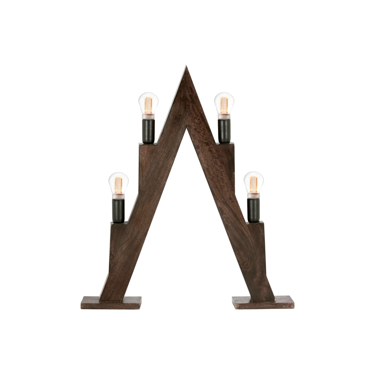 Der 4-flammige Lichterbogen Torsby ist aus massivem, dunkel gebeiztem Mangoholz gefertigt. Die Lampenhalter bestehen aus schwarz lackiertem Metall. Es werden vier LED-Leuchtmittel mitgeliefert. Am Kabel ist ein Dimmer verbaut, über den sich die Helligkeit noch regulieren lässt.