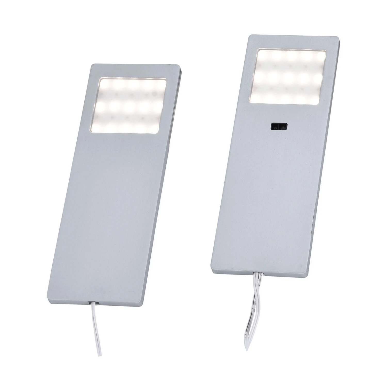 Um die Arbeitsplatte in der Küche zu beleuchten, bietet sich die LED-Unterbauleuchte Helena an, die in flacher, rechteckiger Form gestaltet und mit je einem warmweiß strahlenden LED-Board ausgestattet ist. Sie wird im praktischen 2er-Set geliefert, wobei jede Leuchte mit einem 180 cm langen Kabel versehen ist. Eine der beiden Leuchten besitzt einen Sensorschalter, der die berührungslose Bedienung beider Leuchten ermöglicht. Über eine gemeinsame, 180 cm lange Zuleitung mit Steckertrafo werden die Leuchten mit Strom versorgt.