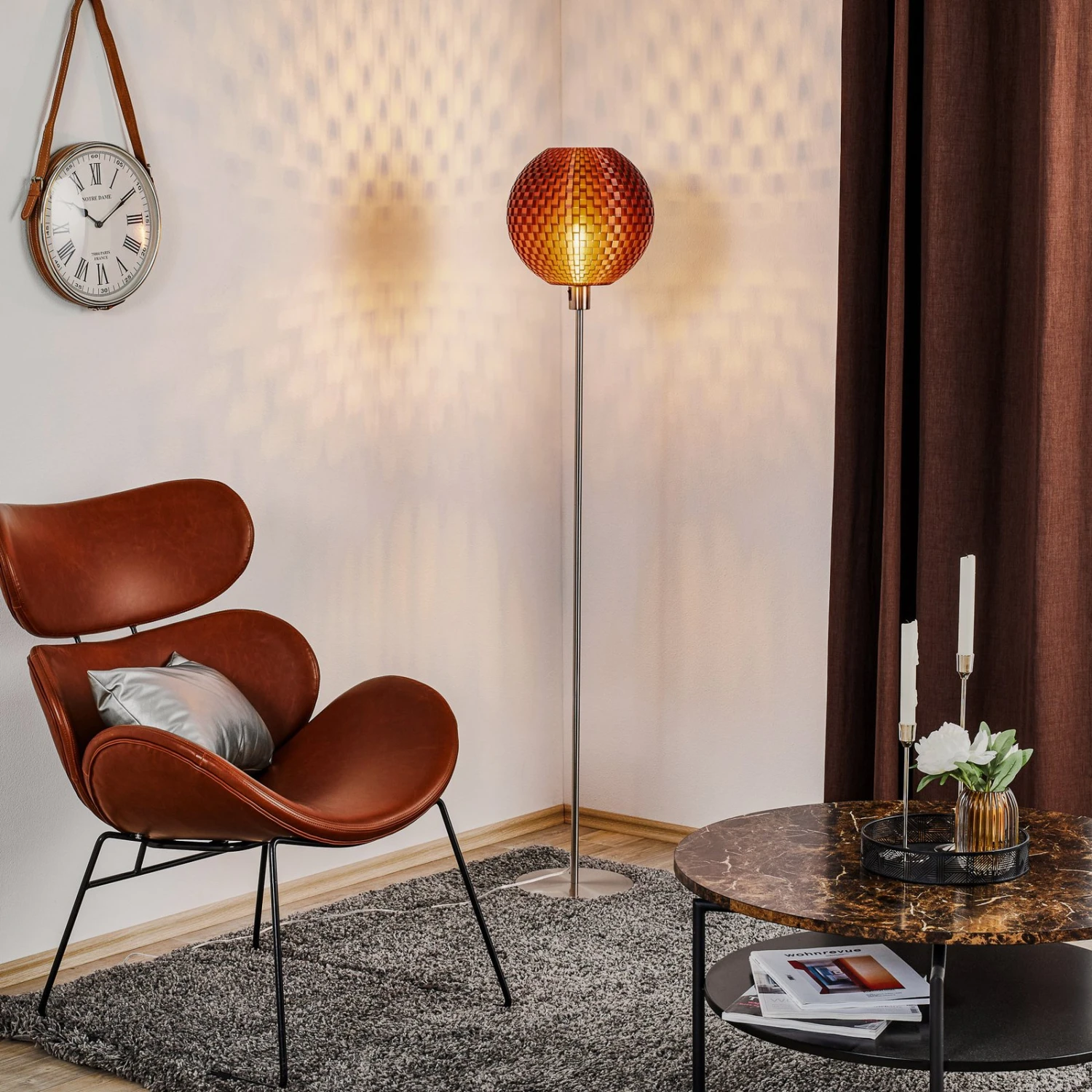 Die moderne Stehleuchte Flechtwerk besitzt einen kugelförmigen Lampenschirm, der mit einer interessanten und dekorativen Webstruktur ausgestattet ist. Die schachbrettartige Optik wirkt nicht nur im ausgeschalteten Zustand sehr elegant, beim Einschalten des Lichts entfaltet die Stehleuchte Flechtwerk erst ihre ganze Strahlkraft. Durch die Aussparungen im Schirm leuchtet das Licht hindurch und schafft eindrucksvolle Licht- und Schattenspiele, die eine bezaubernde Atmosphäre schaffen. Die Herstellung dieses Schirms ist dabei besonders: Mit einem speziellen 3D-Drucker wird der Lampenschirm ohne jeglichen Abfall oder Verschnittreste gedruckt. Verwendet wird hierbei ein recycelbarer Rohstoff, der ohne toxische Stoffe oder Erdöl auskommt. Damit ist die Stehleuchte Flechtwerk auch ein ökologisches wie nachhaltiges Produkt, da es ressourcenschonend und ohne Emissionen gefertigt wird.