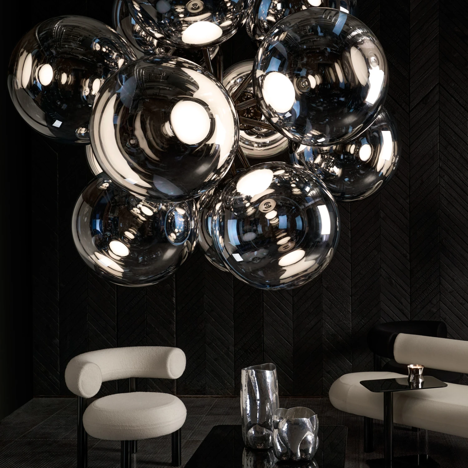 Der Anblick des 12-flammigen Kronleuchters Burst ist ein- wie ausgeschaltet einfach nur faszinierend. Zwölf Kugelschirme aus bruchsicherem Polycarbonat bilden die ungewöhnliche Optik dieser großen Hängeleuchte. Die Kugelschirme sind alle mit einem metallisierenden Oberflächenfinish versehen, das schon unbeleuchtet durch das Auftreffen von Sonnenstrahlen zum Funkeln gebracht wird. Besonders glanzvoll präsentiert sich Globe Burst dann, wenn die integrierte LED-Beleuchtung eingeschaltet wird und wundervolle Reflexionen entstehen. Das Licht wird nach allen Seiten abgestrahlt und kann mittels externem Dimmer in seiner Helligkeit reguliert werden.