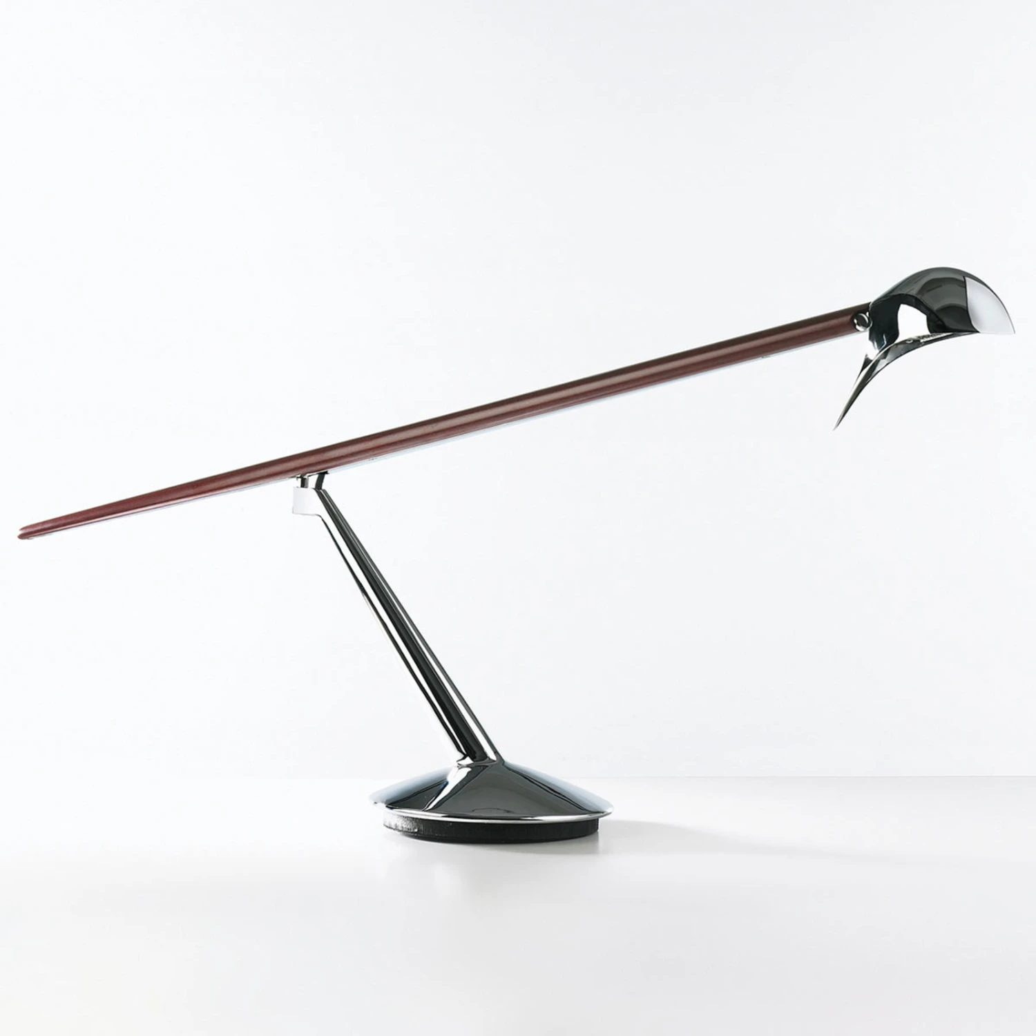 Die LED-Tischlampe Bluebird trägt ihren Namen wohl nicht von ungefähr, lässt sich doch ihre Optik leicht mit der eines Vogels interpretieren. Dazu trägt das Design des verstellbaren Leuchtenkopfes das Seine bei. Ein weiteres Indiz dafür, dass der Designer Jorge Pensi sich von der Vogelwelt zu diesem Leuchtenentwurf hat inspirieren lassen, liegt in der Beschaffenheit des Leuchtenarmes aus Holz, der auf dem Fuß zu balancieren scheint. Eine ungewöhnliche Tischlampe, die mit ihrem warmweißen LED-Licht eine stimmungsvolle Lichtwirkung erzielt.