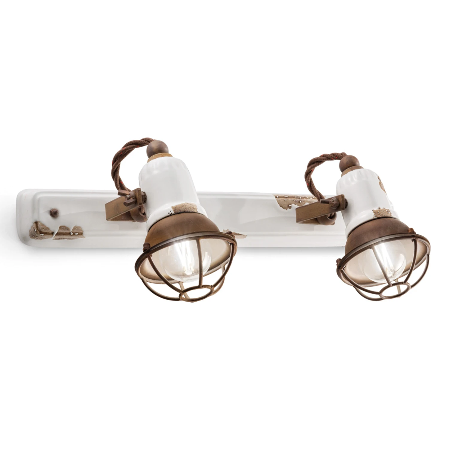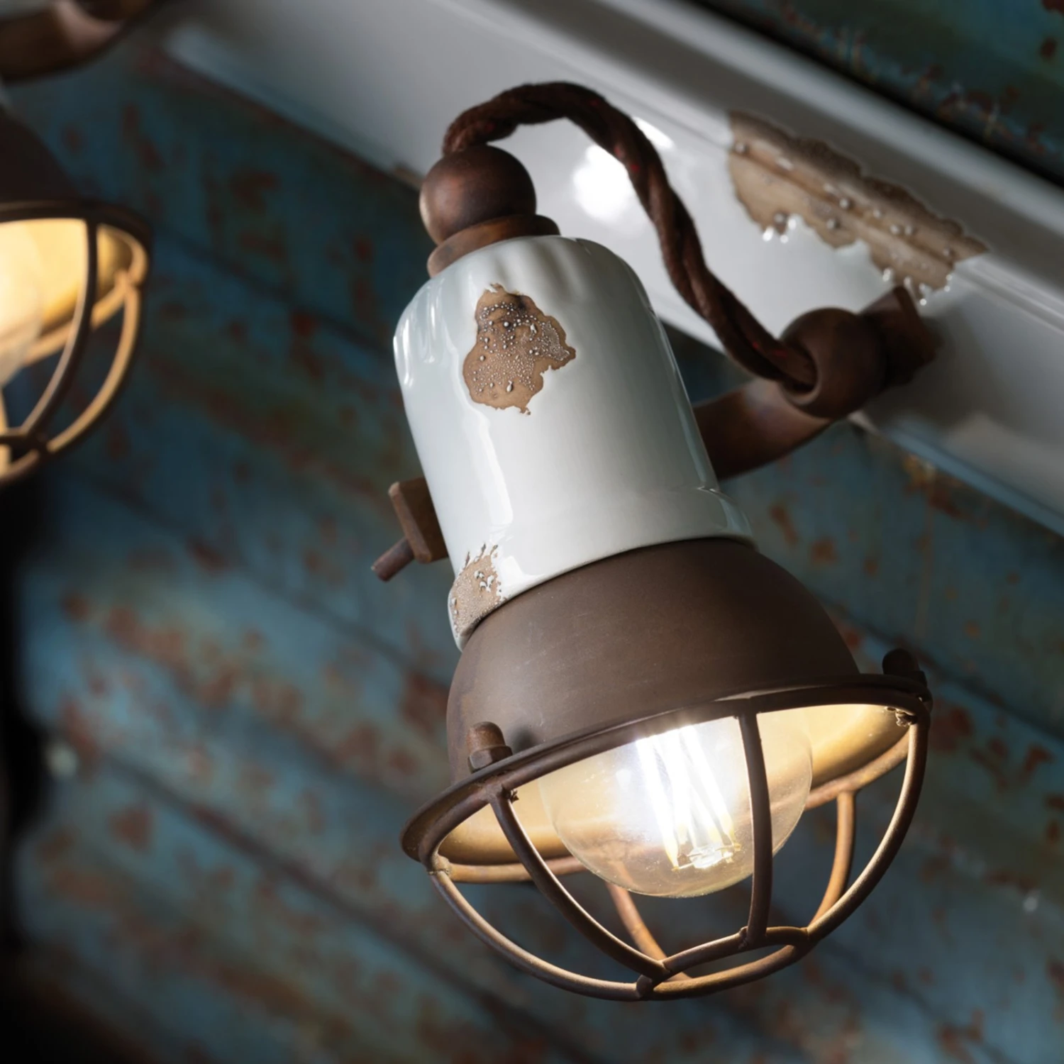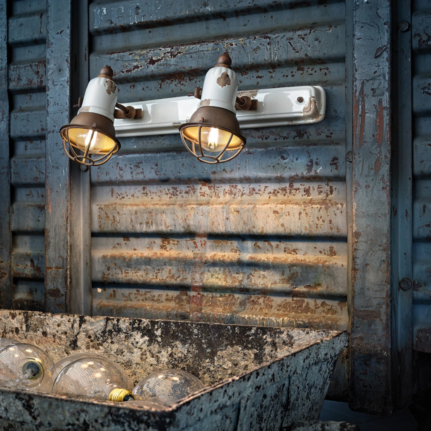Sie ist zwar eine neue Leuchte, aber sie sieht aus, als hätte sie schon einige Jahrzehnte treue Dienste geleistet, wobei die Zeit naturgemäß ihre Spuren hinterlassen hat. So lässt sich der zweiflammige Wandspot C1676/1 beschreiben, der anhand dieser Charakteristiken eindeutig in die Stilrichtung Retro bzw. Vintage einzuordnen ist. Der Korpus aus Keramik wurde mit einem weißen Lack versehen, der so aussieht, als hätte der Zahn der Zeit bereits an ihm genagt. Auch der Metallschirm mit dem Schutzkorb für das Leuchtmittel passt mit seinem Rostbraun zu dem Look des Alten und Gebrauchten.
